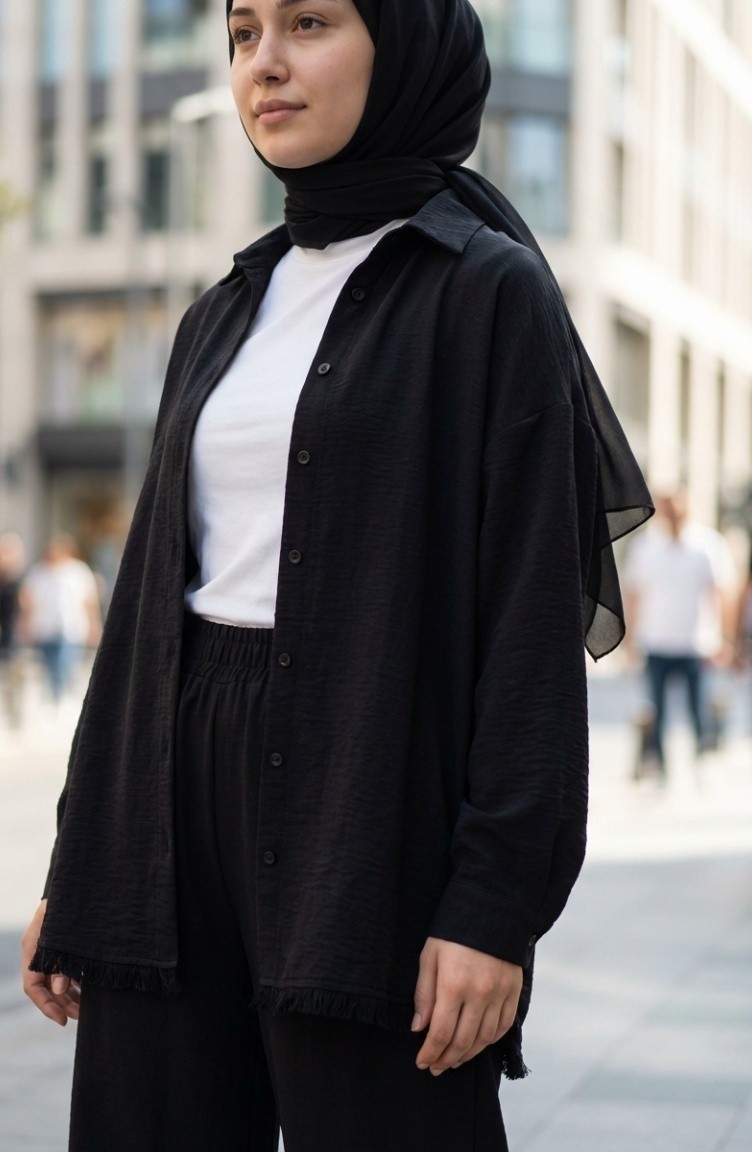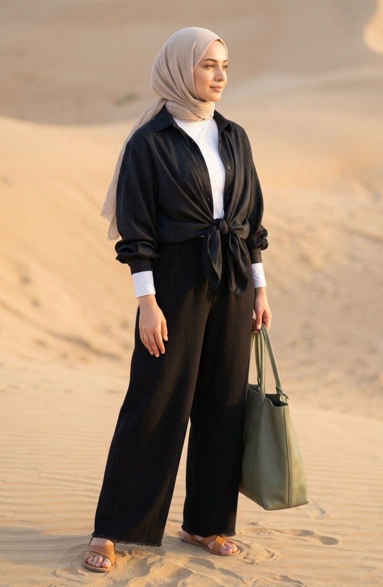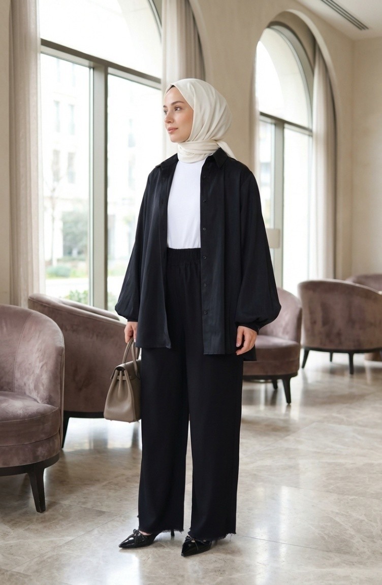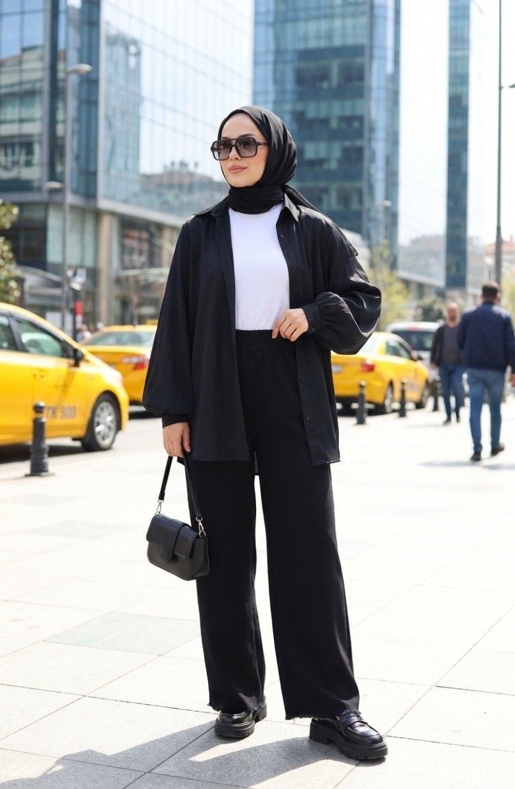 Siyah renktedir. Pamuk dokuma kumaş. Sade. Lastik detaylı. 4 Mevsim tercih edebilirsiniz. Büyük beden seçeneği mevcuttur.