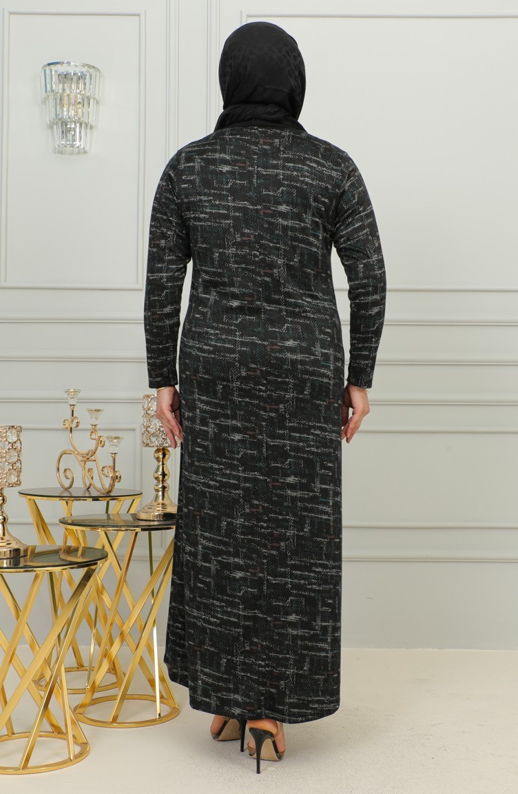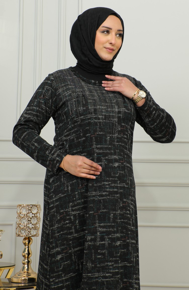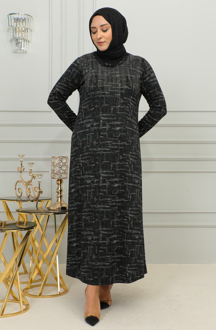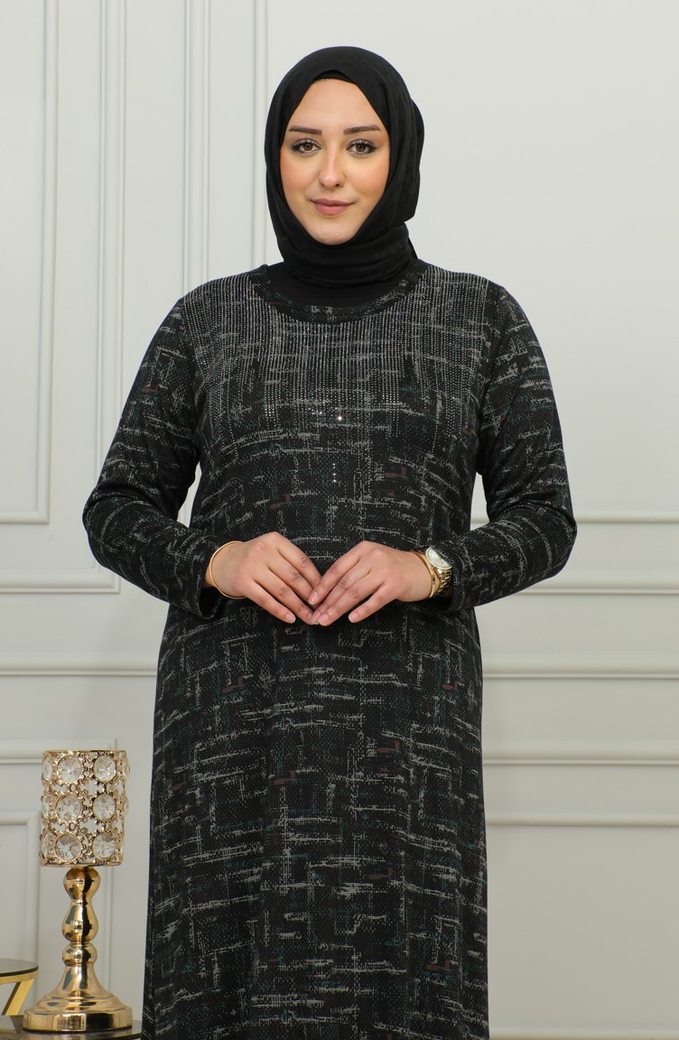 Büyük Beden Taş Baskılı Desenli Elbise 4425A-02 Yeşil