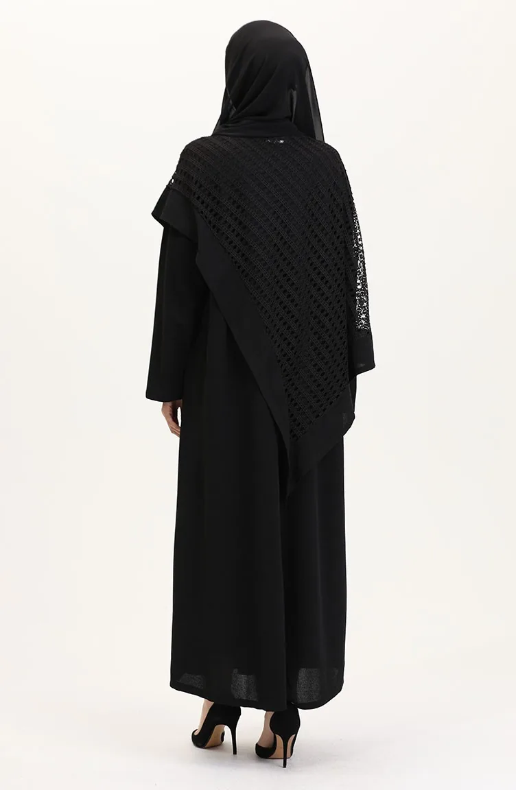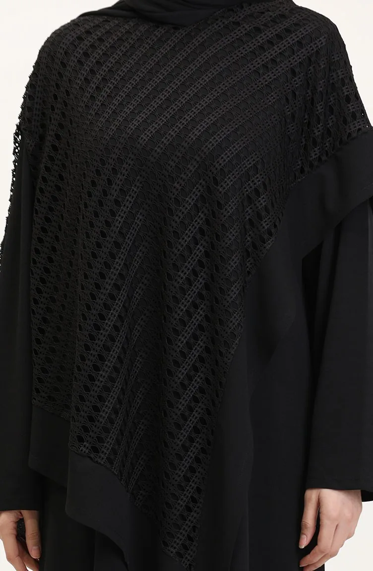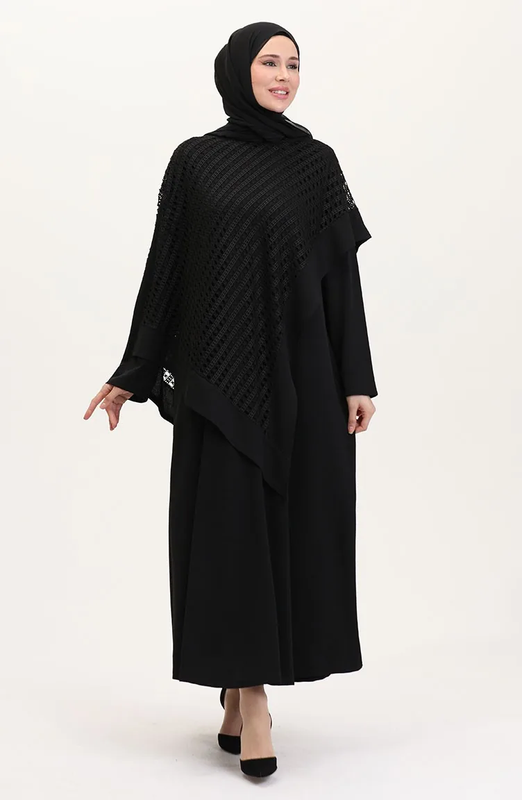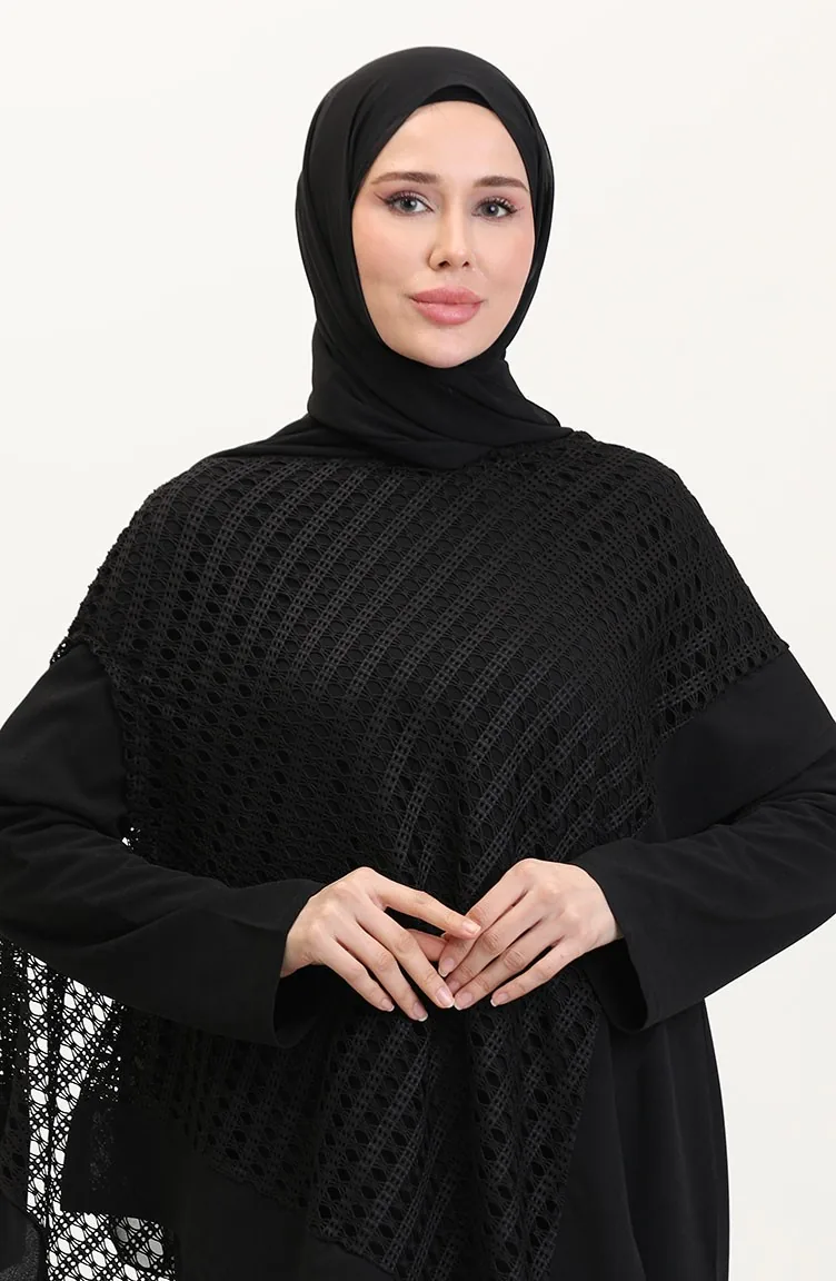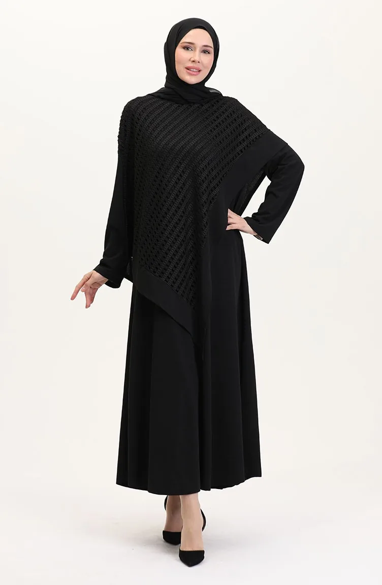 Siyah renktedir. Krep kumaş. Sade. File kumaş. 4 Mevsim tercih edebilirsiniz. Büyük beden seçeneği mevcuttur.