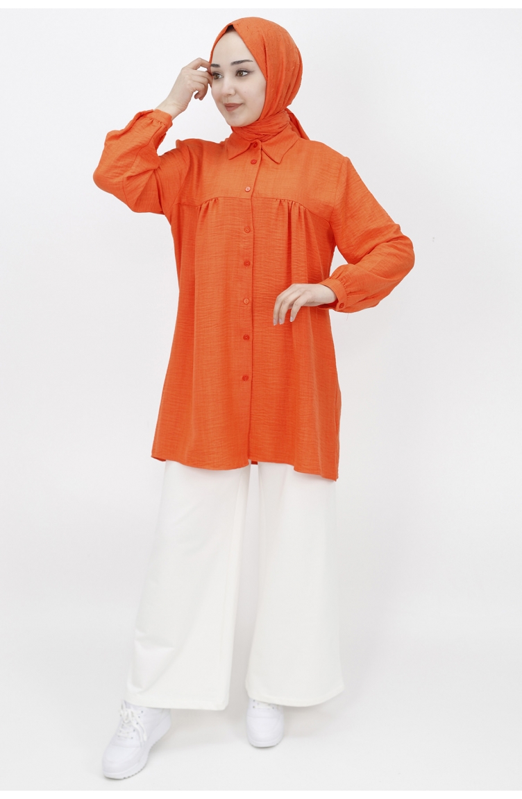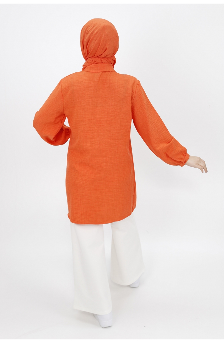 Es ist mit der Präferenz des Stoffes mit orange Farbe gestaltet. Aerobin. Es ist eine klare Sicht. Es wurde mit Knopf verwendet, um die Verwendung zu vereinfachen. Es ist Langärmlig. Hemdkragen ist ein Muss für viele Kombinationen. Entwickelt für den Sommer. Frau. Der Körpergröße, den die Models trägt, ist optisch visuelle körpergröße.