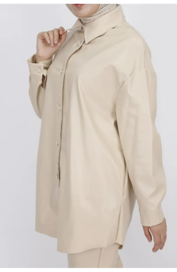 suni deri, gömlek yaka, düğmeli, uzun kollu, mankenin giydiği beden:38, kumaş değerleri;%100 polyester, ürün ölçüleri;göğüs:50,bel:54,basen:58,boy:82cm, mankenin ölçüleri;boy:168cm,göğüs:85,bel:65,basen:90,kilo:55