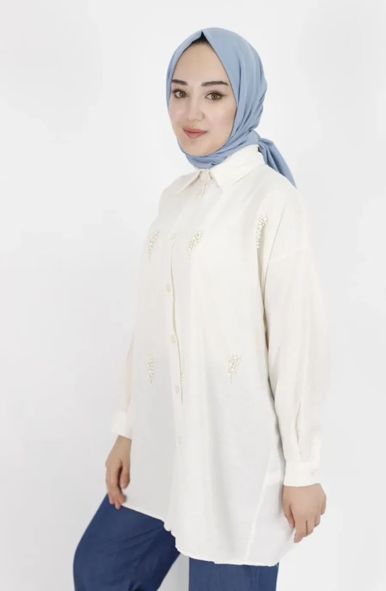 Naturfarbe wird verwendet. Das Leinengewebe ist hitzebeständig. Und zu allen Jahreszeiten verfügbar. Es ist eine klare Sicht. Es ist Langärmlig. Hemdkragen ist ein Muss für viele Kombinationen. Entwickelt für den Sommer. Frau. Geniş Kesim.