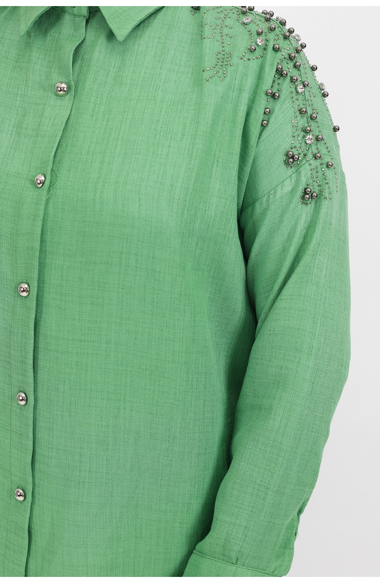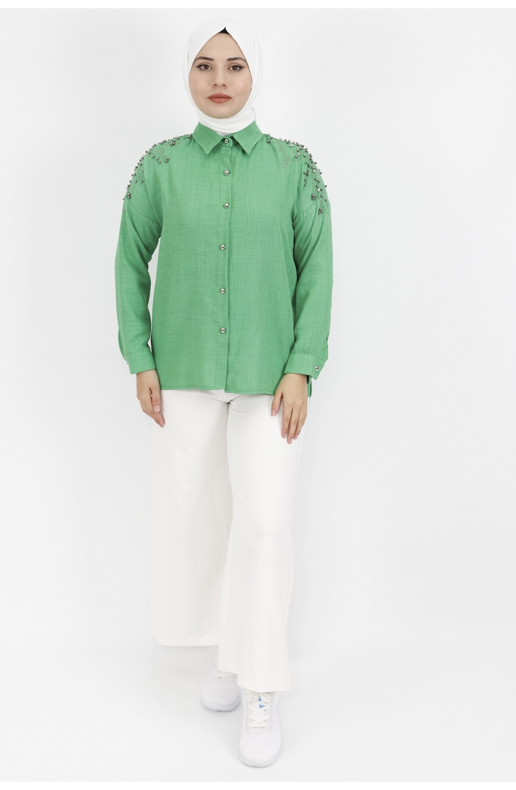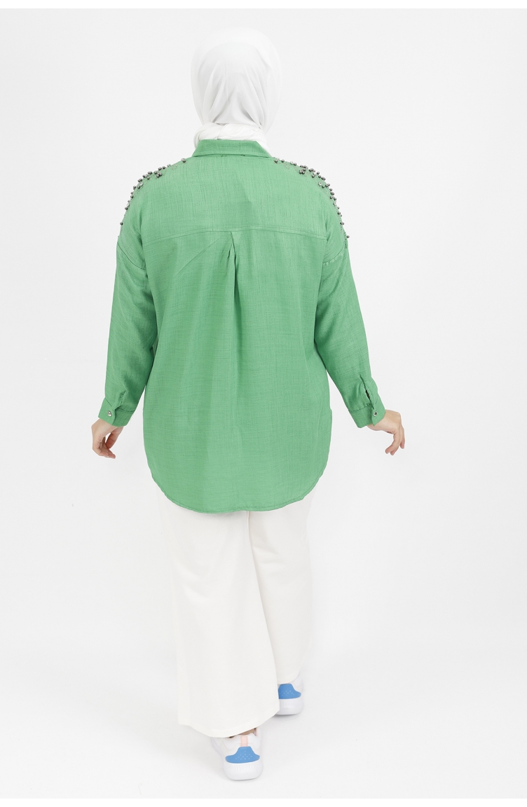 Es wurde Grünfarbe verwendet. Das Leinengewebe ist hitzebeständig. Und zu allen Jahreszeiten verfügbar. Es ist eine klare Sicht. Es ist Langärmlig. Hemdkragen ist ein Muss für viele Kombinationen. Entwickelt für den Sommer. Frau. Große Größen Option ist verfügbar.