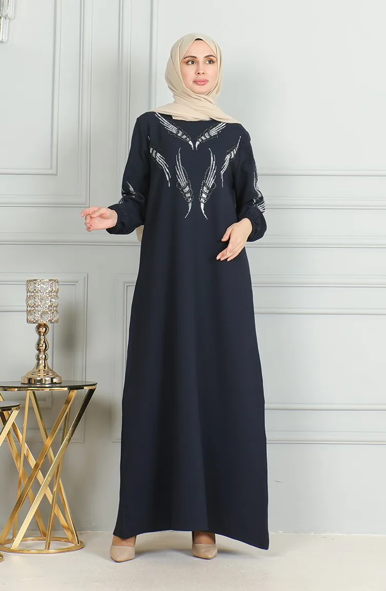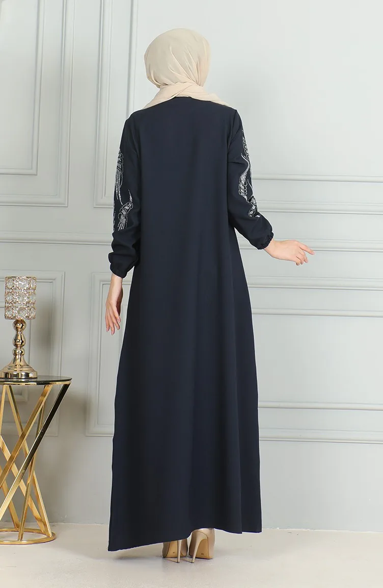 Stoned Abendkleid Mit Elastischen Ärmeln 0497-04 Marineblau 0497-04