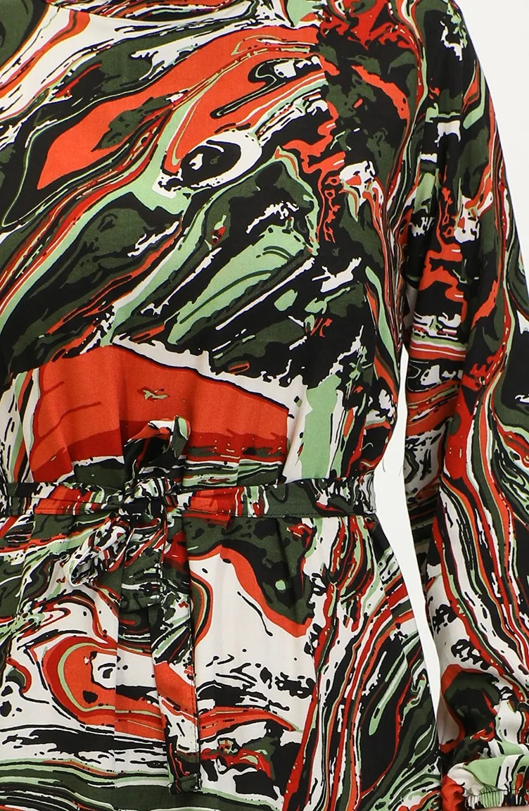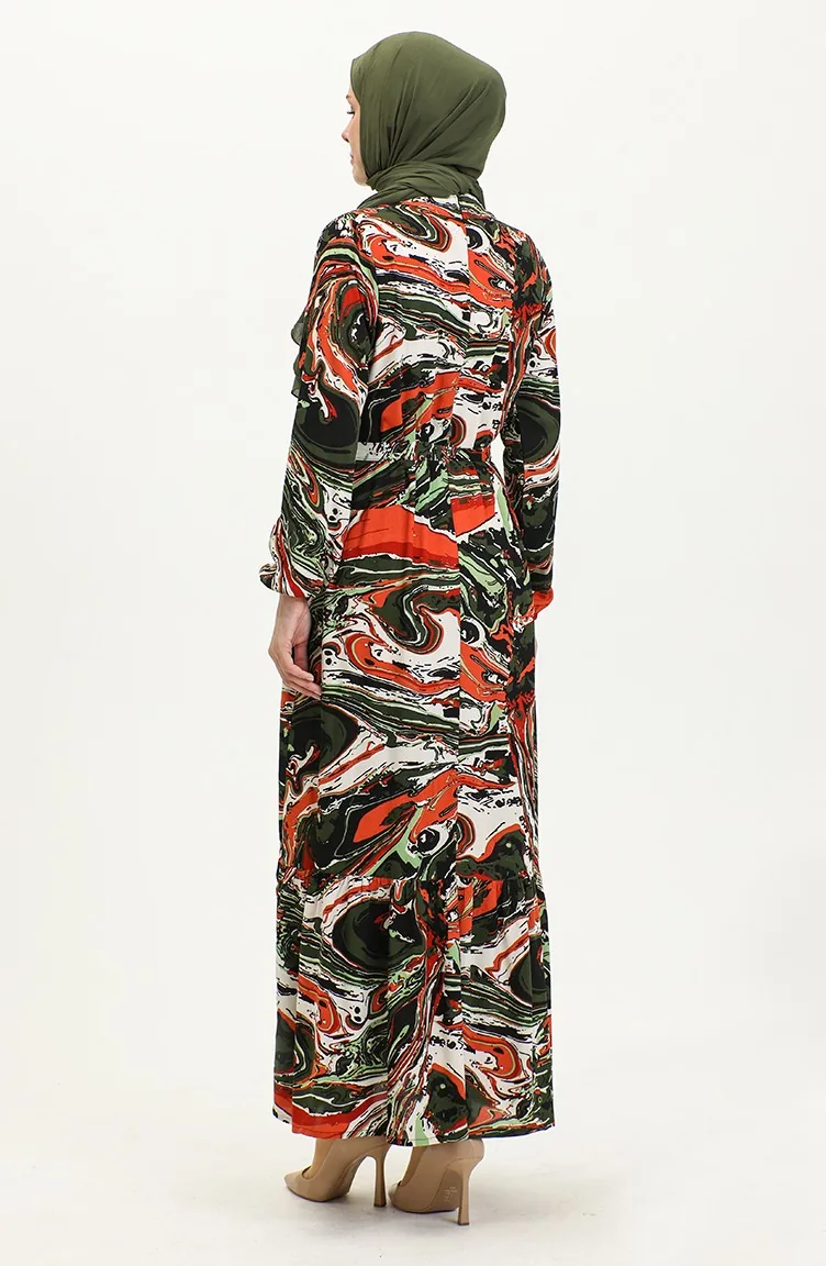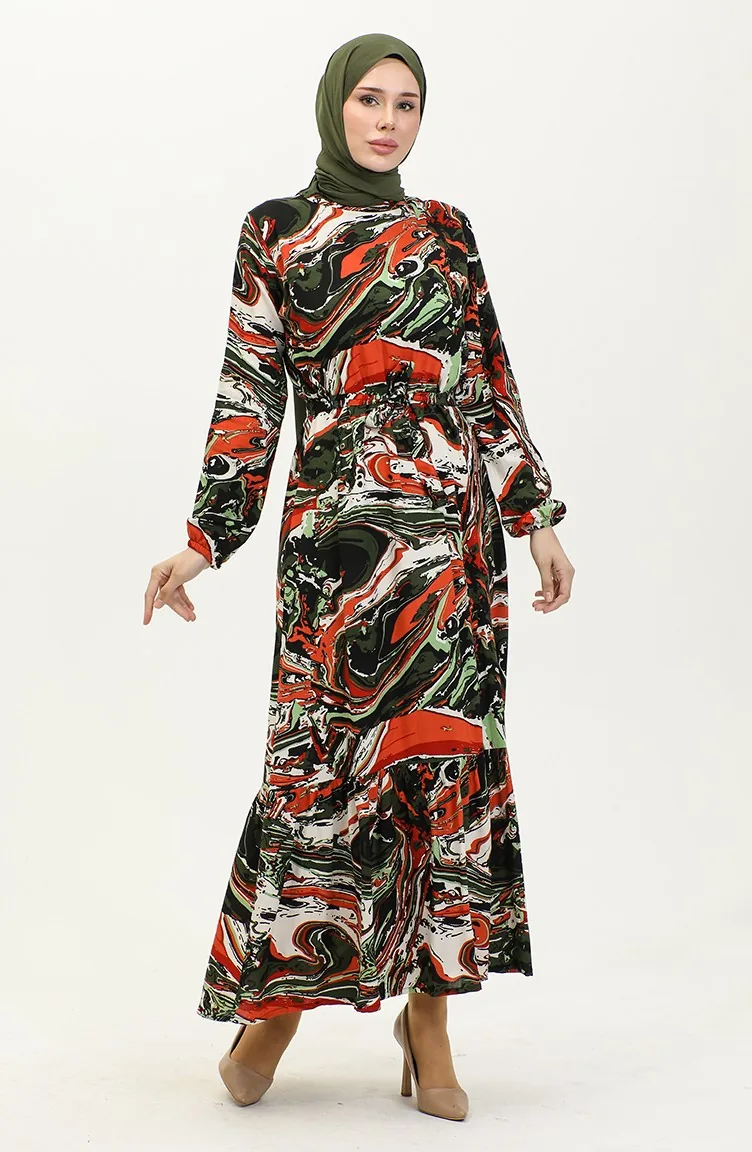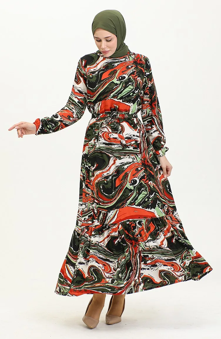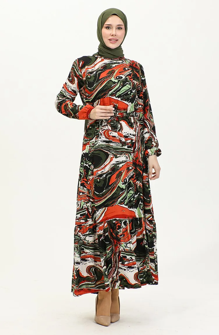Kleid Aus Viskose Mit Gemischtem Muster Und Gürtel 0424-02 Khaki Tile 0424-02