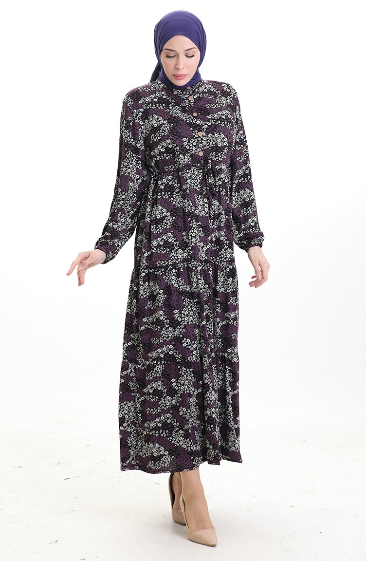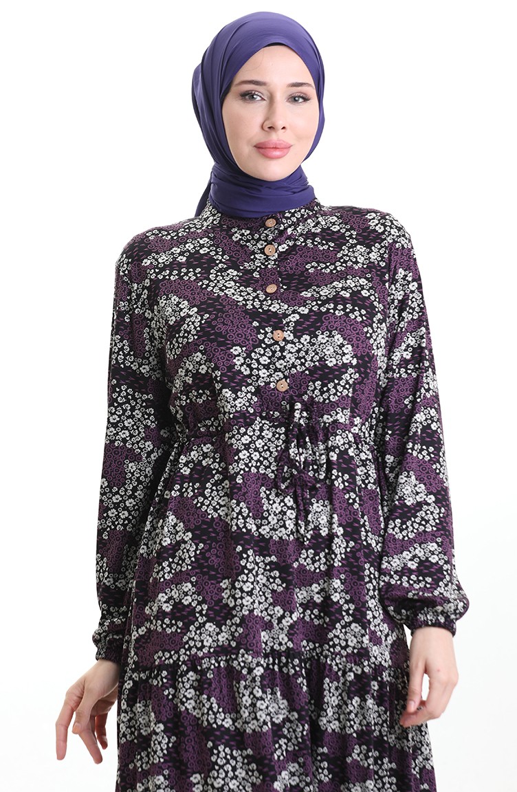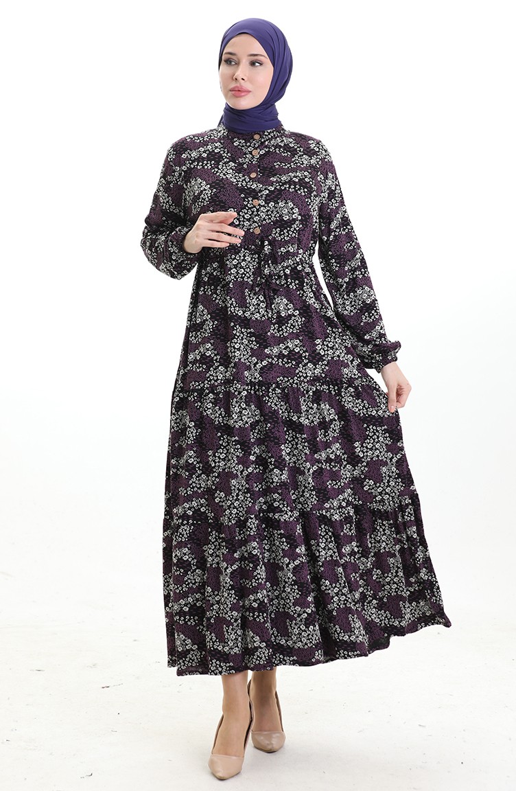 Kleid Mit Gemustertem Judge-Kragen Und Gebundener Taille 0200-03 Schwarz Lila 0200-03