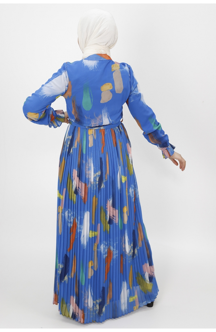 Saks-Blaufarbe verwendet. Der Chiffon Stoff hat eine transparente und leichte Textur. Entworfen mit gemustertem Stoff. Der Gürtel wird als Zubehör verwendet. Hat ein stilvolles Aussehen. Es ist Langärmlig. Jede Kleidungsseite ist die bevorzugte Nullkragenform. Entwickelt für den Sommer. Frau. Der Körpergröße, den die Models trägt, ist optisch visuelle körpergröße.