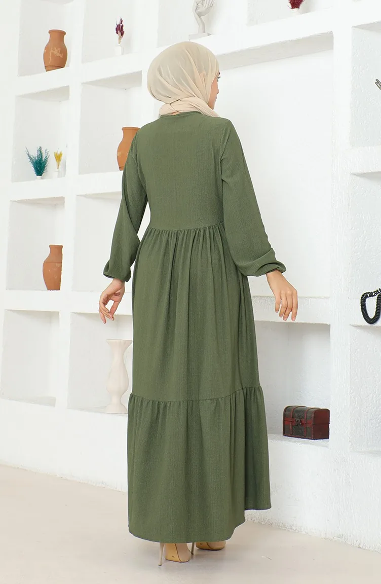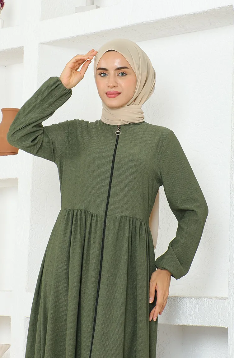 Bürümcük-Stoff Geraffte Abaya Mit Reißverschluss 1018-05 Khaki 1018-05
