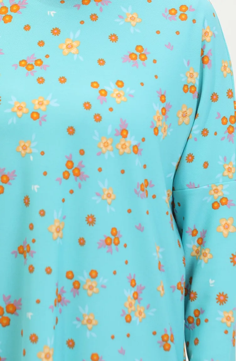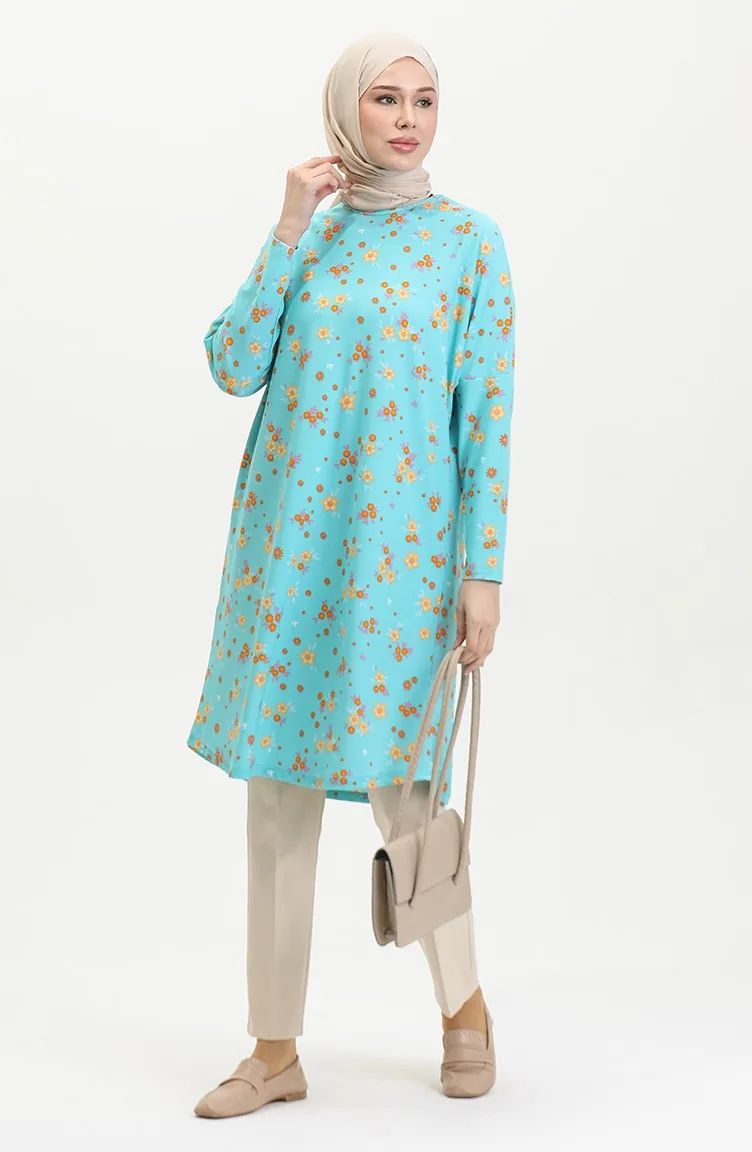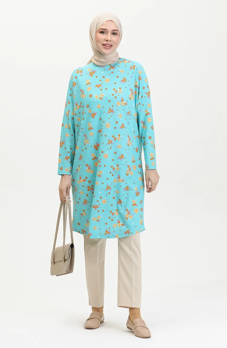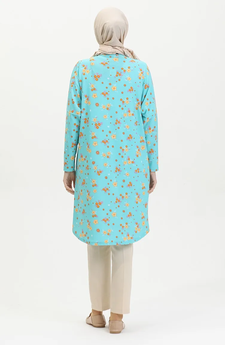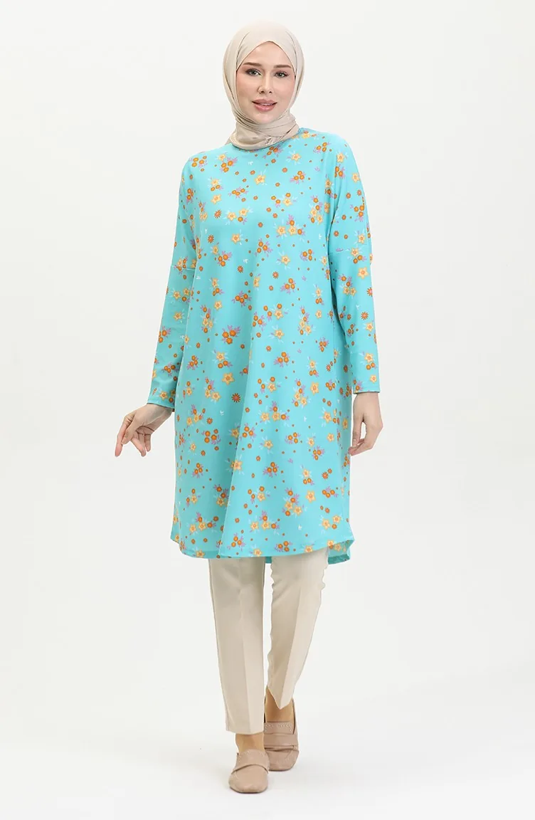 Blumengemusterte Entspannt Geschnittene Fließende Krepp-Tunika 8717-01 Mintblau 8717-01