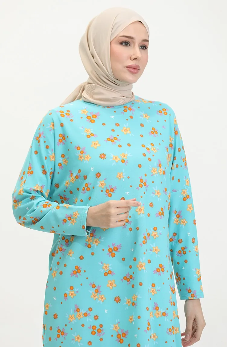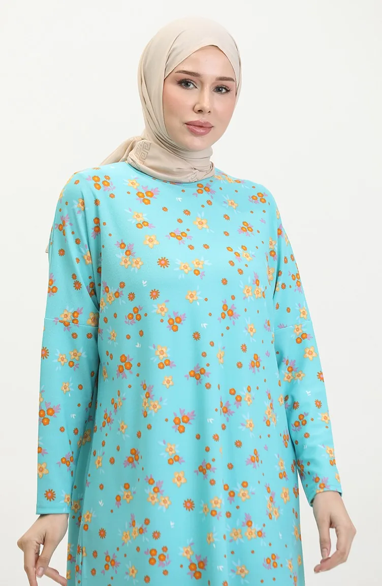 Minzenblau farbe wird verwendet. Krepp ist angenehm zu verwenden mit nicht-faltige Textur. Es hat Blumenmuster. Mit Fledermaus Ärmel. Jede Kleidungsseite ist die bevorzugte Nullkragenform. Es ist mit Stoff gestaltet, der zu jeder Jahreszeit bevorzugt werden kann. Große Größen Option ist verfügbar.