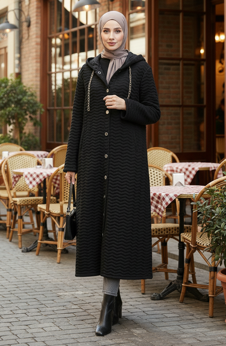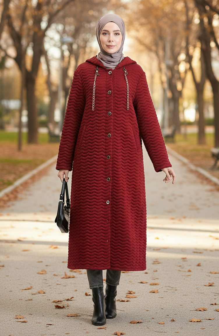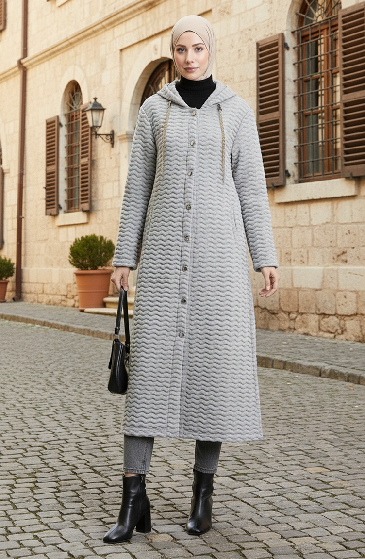 Graue Farbe wird verwendet. In den Wintermonaten stehen die gesteppten Modelle im Vordergrund. Entworfen mit gestreiften gemusterten Stoff. Es wurde mit Knopf verwendet, um die Verwendung zu vereinfachen. Dicker Stoff ist mit Winter konzipiert. Die Länge wird gemäß den Standardgrößen angepasst.