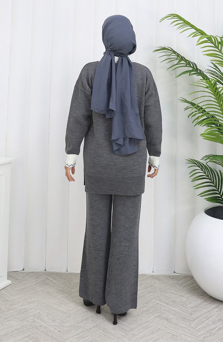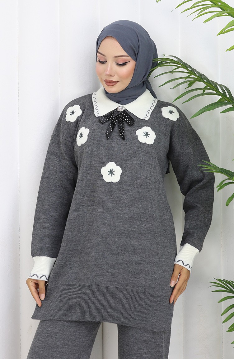 Strickmode Blumen Applikation Tunika Hose Zweiteiler 1113-07 Grau 1113-07