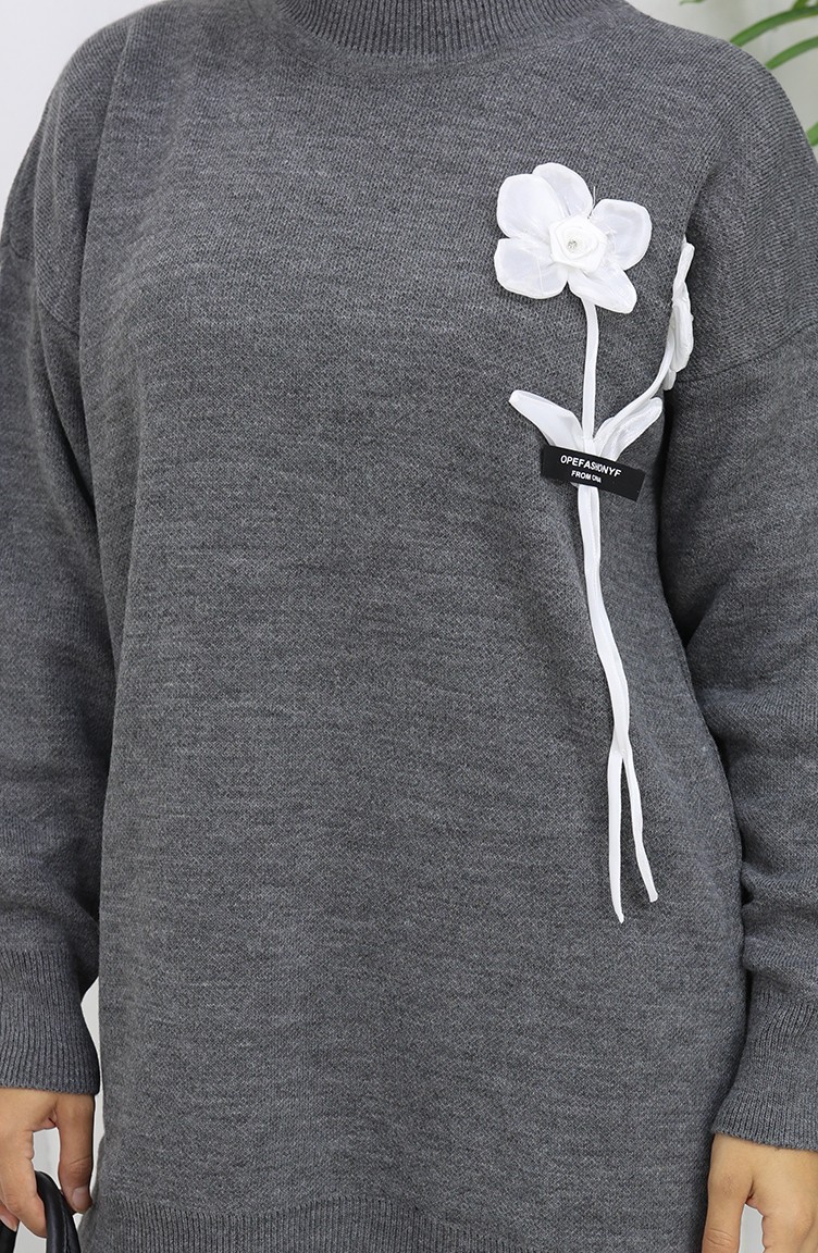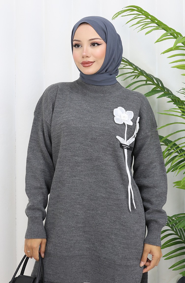 Strickmode Blumen Detail Tunika Hose Zweiteiler 1037-08 Grau 1037-08