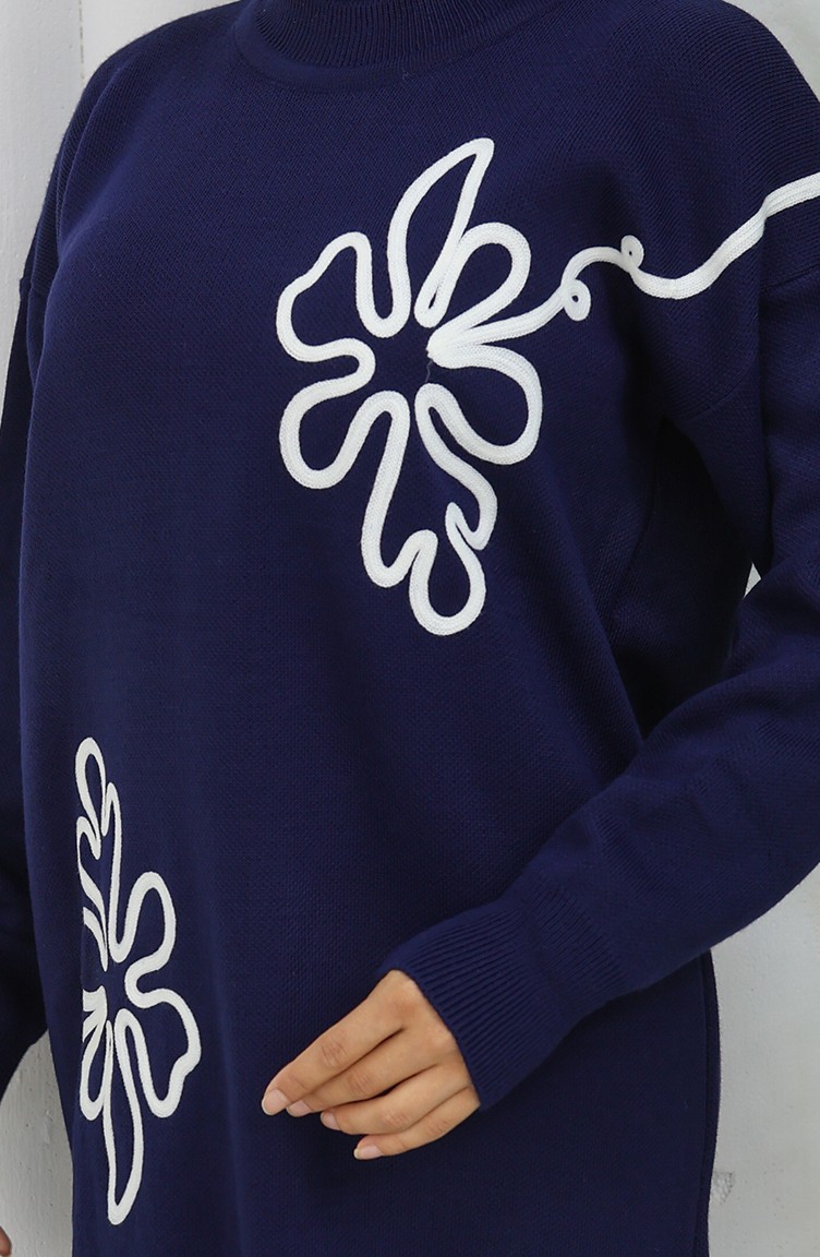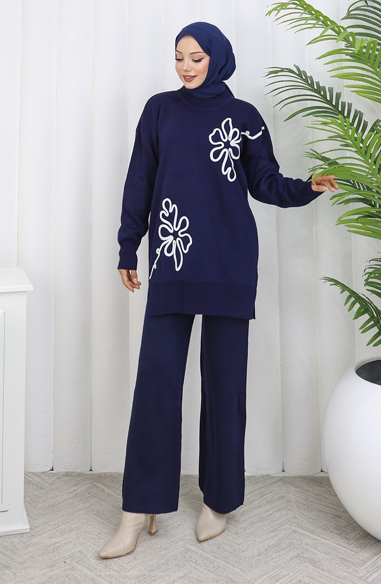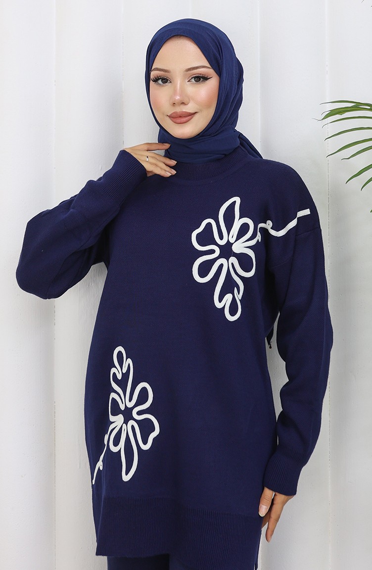 Strickmode Blumenmuster Tunika Hose Zweiteiler 1110-07 Marineblau 1110-07