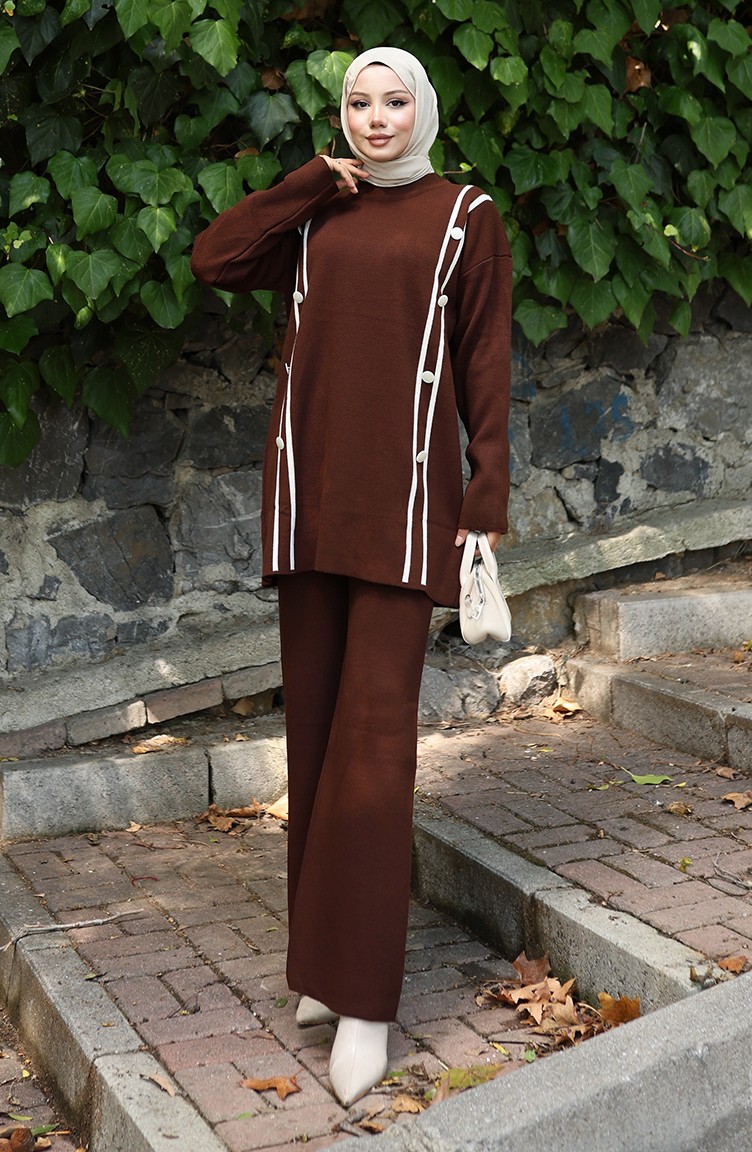 Strickmode Geknöpfte Tunika Hose Zweiteiliger Anzug 1128-07 Braun 1128-07