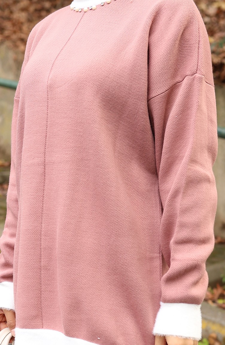 Es hat Beige Rosefarbe. Es ist mit Acrylstoff hergestellt. Es ist eine klare Sicht. Wenn die Tunika mit einem anderen Produkt kombiniert wird, erhält man einen schönen Anzug. Dicker Stoff ist mit Winter konzipiert. Der Körpergröße, den die Models trägt, ist optisch visuelle körpergröße.