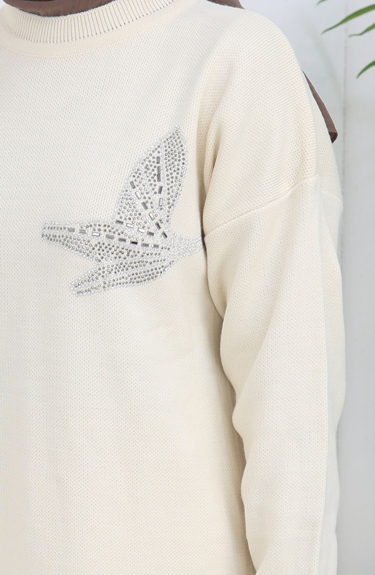 Es ist Beige Farbe. Es ist mit Acrylstoff hergestellt. Es ist eine klare Sicht. Wenn die Tunika mit einem anderen Produkt kombiniert wird, erhält man einen schönen Anzug. Dicker Stoff ist mit Winter konzipiert. Der Körpergröße, den die Models trägt, ist optisch visuelle körpergröße.