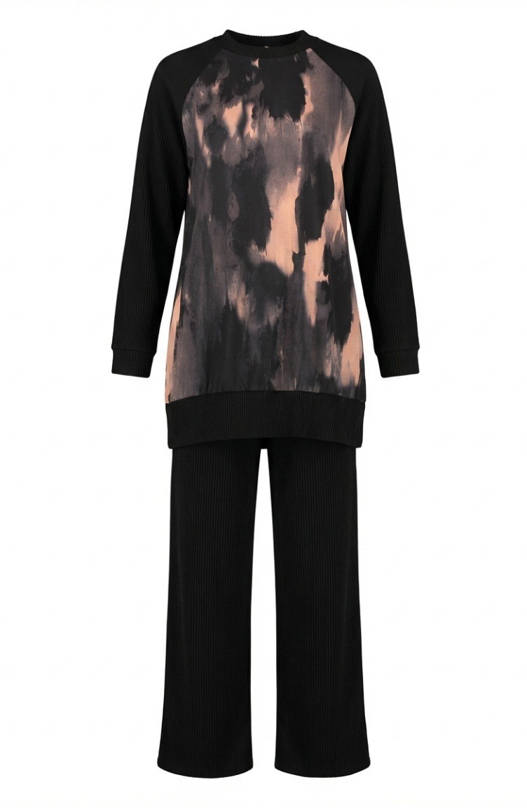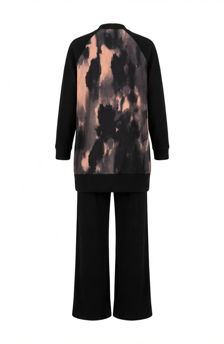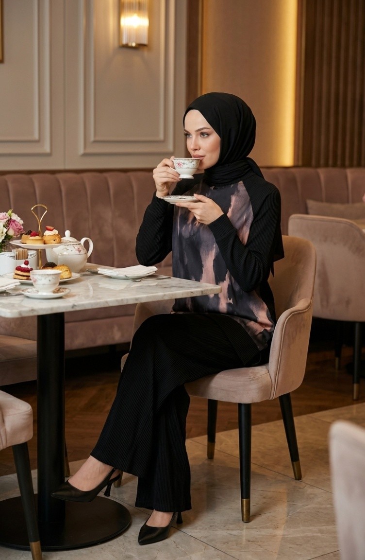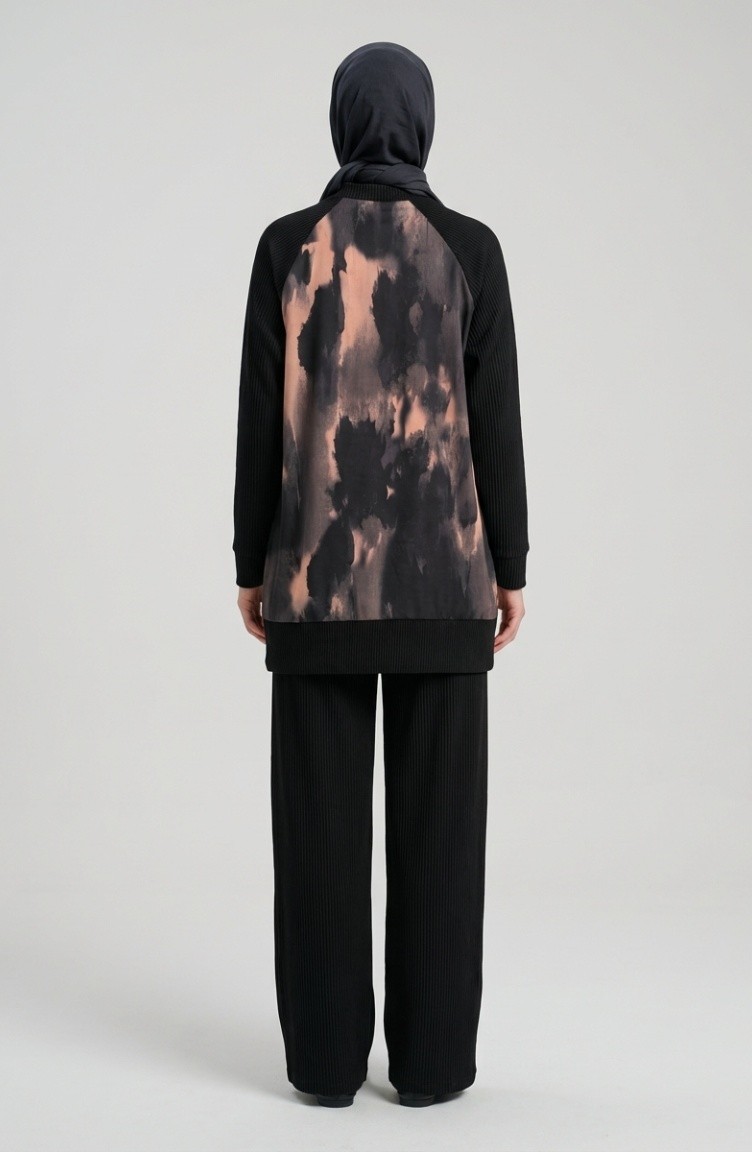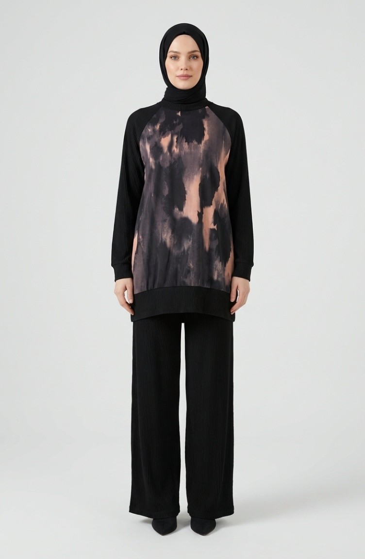 Bedrucktes Plissiertes Tunika- Und Hosen-Zweiteiler-Set 2215-03 Schwarz Lachs 2215-03