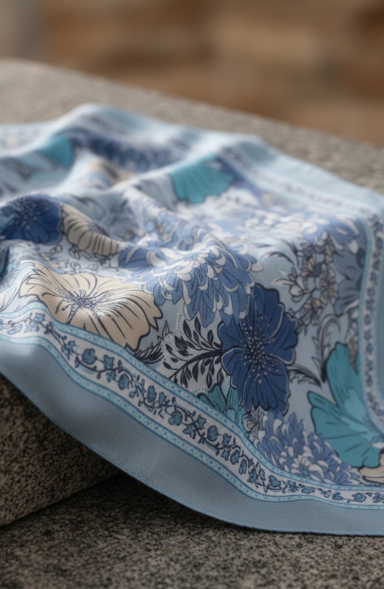 Çiçek Desenli Kehribar Şal 70358-07 Buz Mavisi