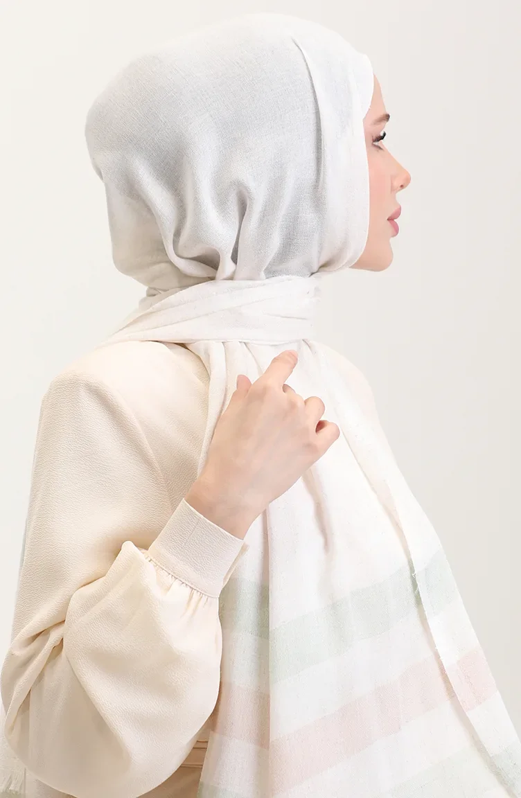 Çizgi Desenli Keten Şal 70287-02 Mint Yeşili Bej