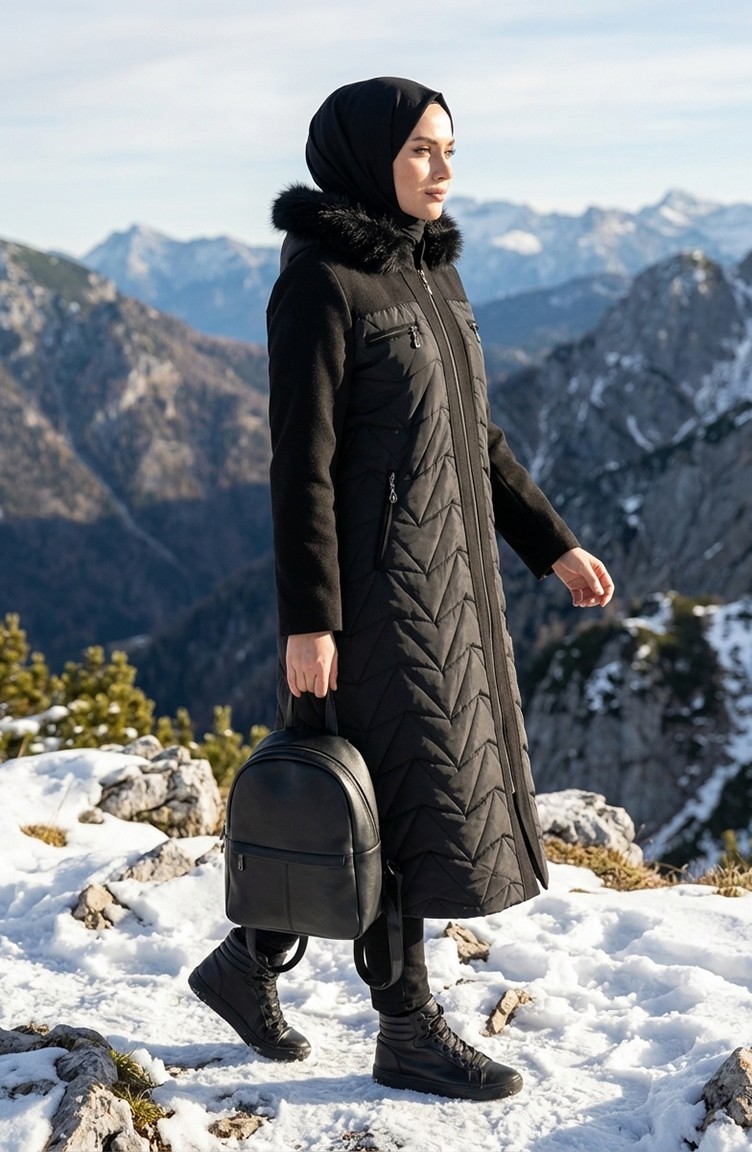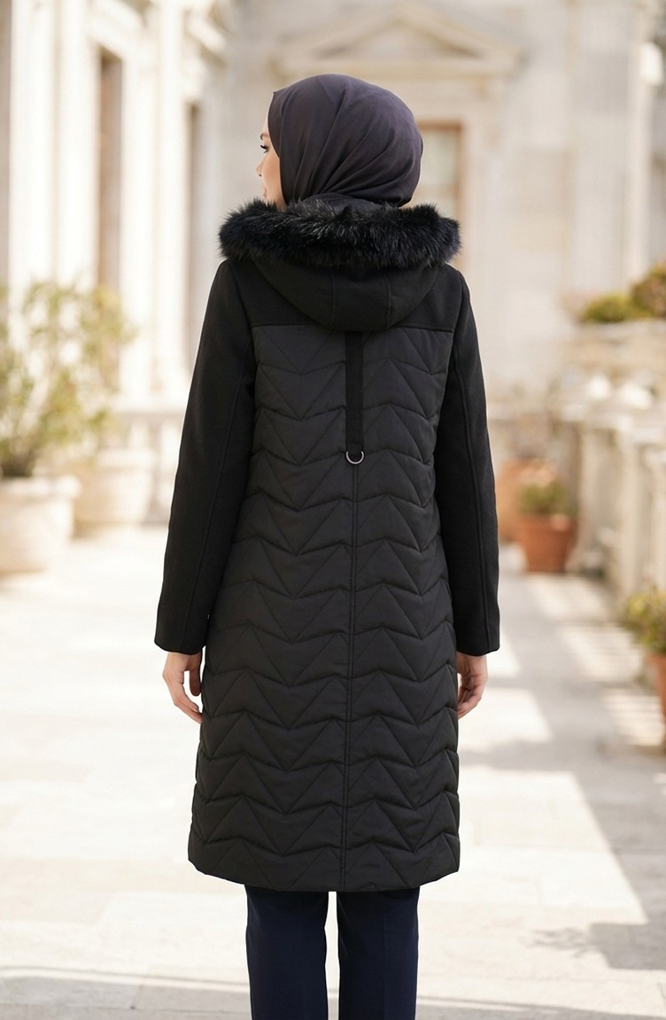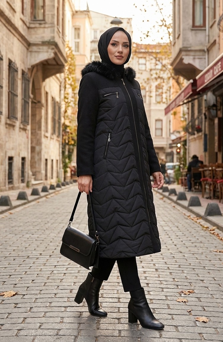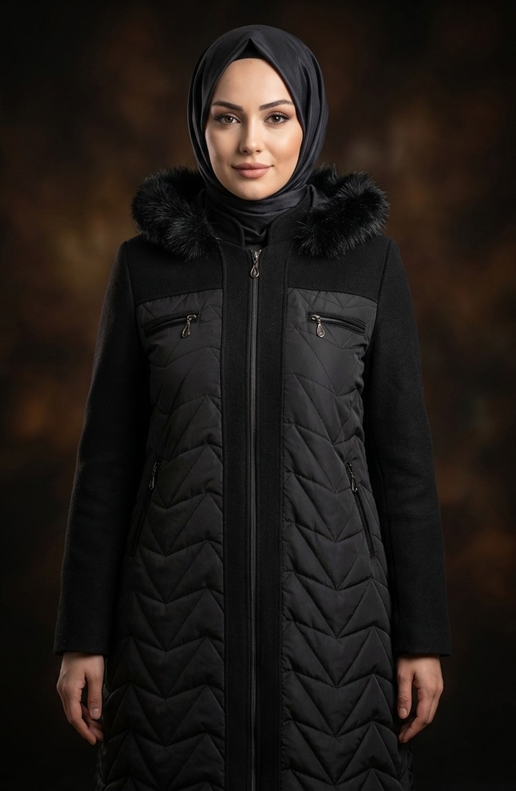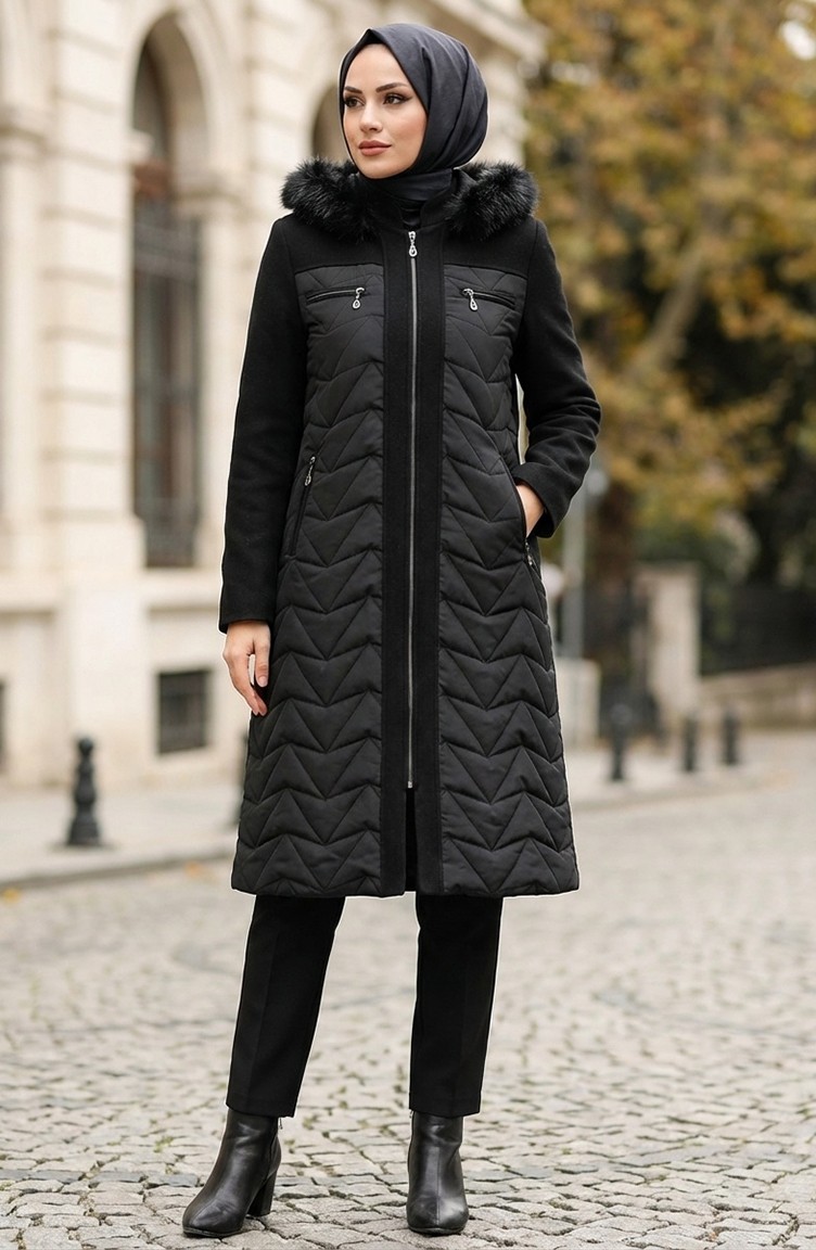 Black color is used. It is cachet fabric, you can use it easily in winter. It has a plain appearance. Since the fabric thickness of the model is in the middle level, the liner is used. Designed from thick fabric. Plus size option available.