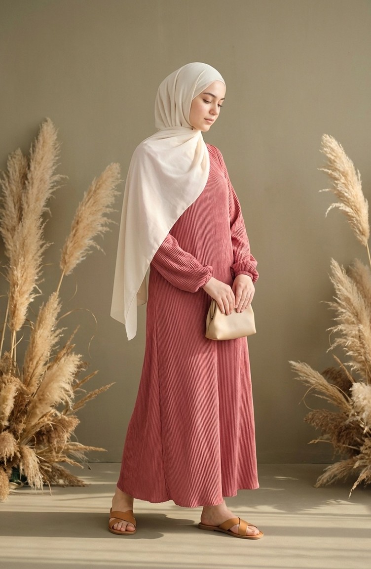 Pleated Hijab Dress With Gathered Waist 2186-02 Rose Pink 2186-02