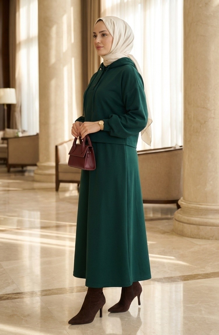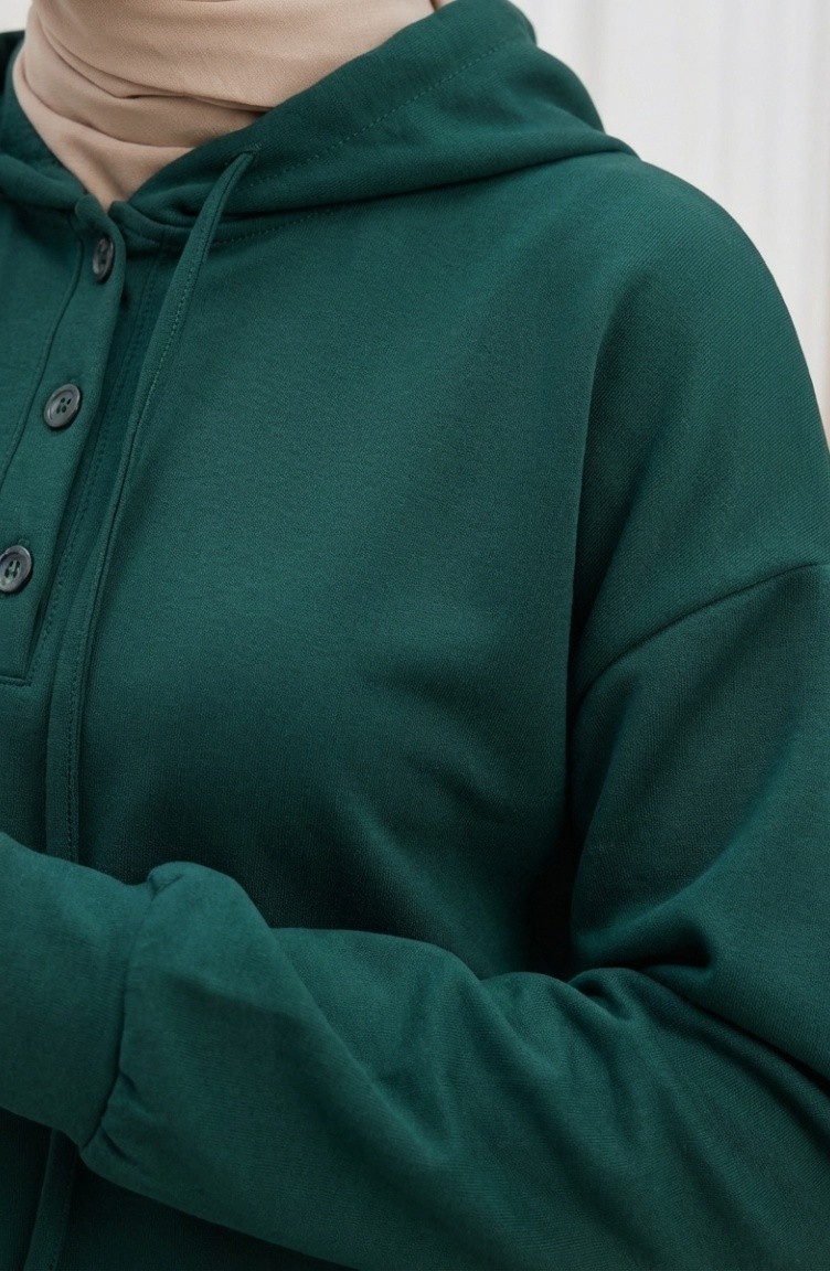 Emerald green color used. scuba crepe scuba crepe fabric. It has a plain appearance. Buttons have been used to make it easy to use. Suitable for 4 seasons. The size worn by the model, is the one on the image.
