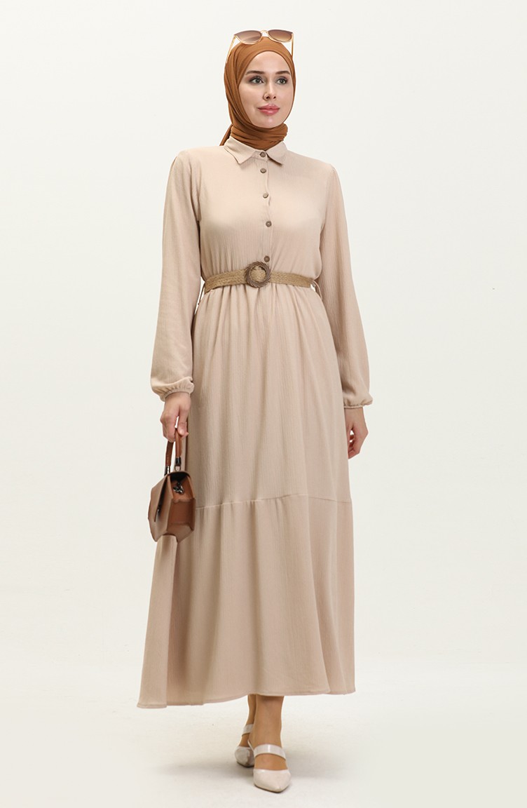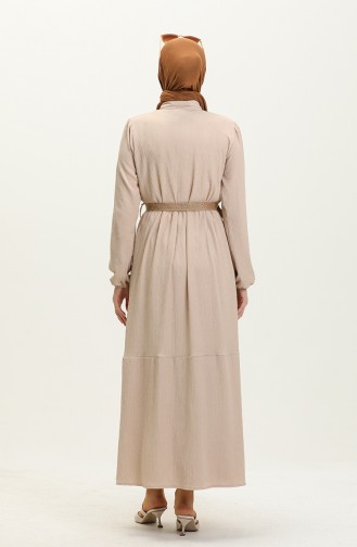 Crepe Fabric Belted Dress 4027-02 Beige 4027-02