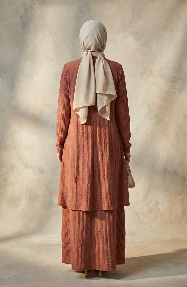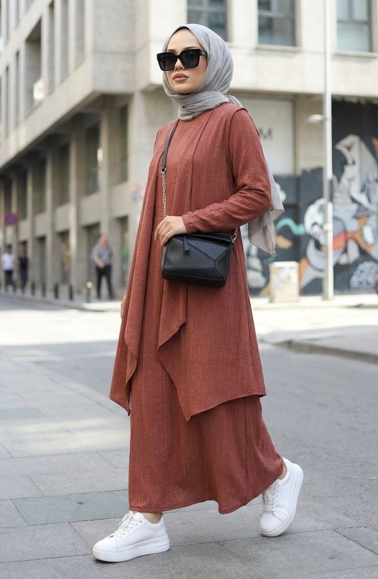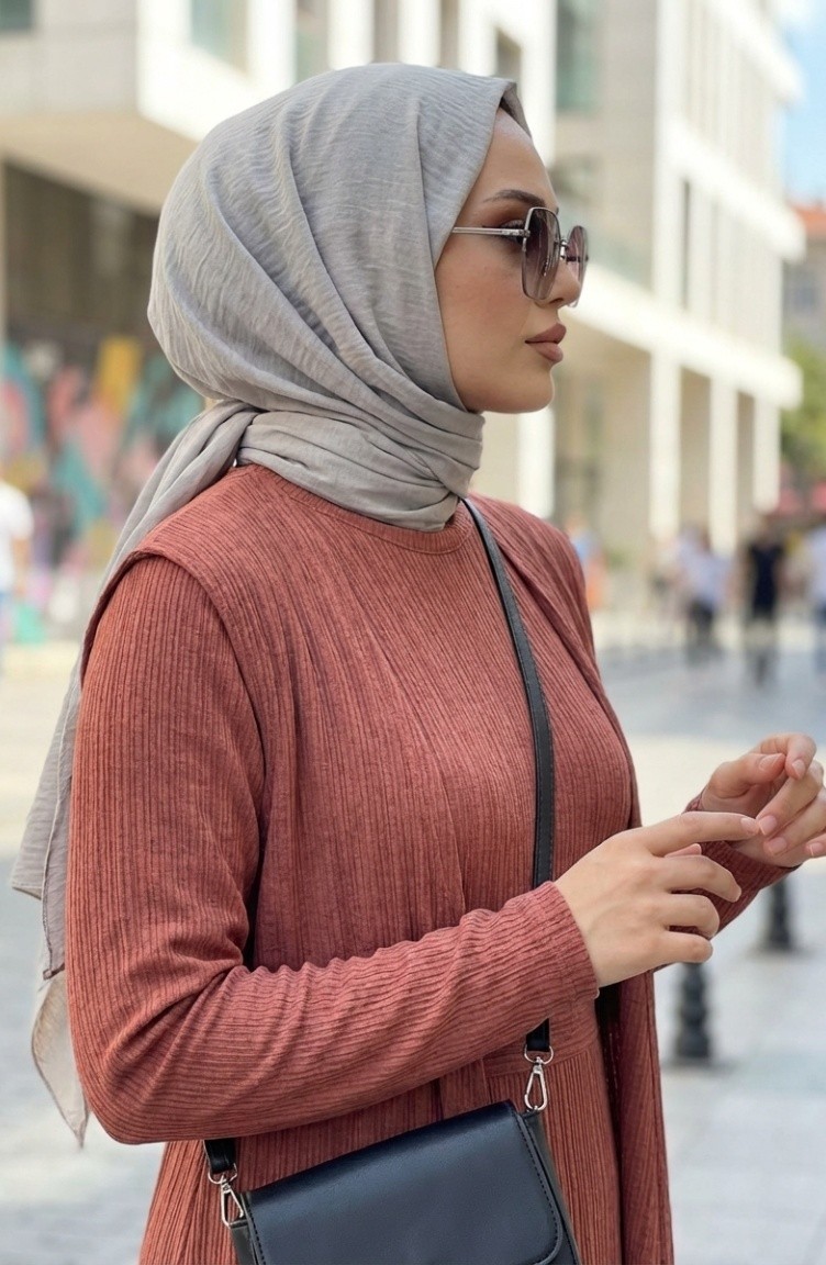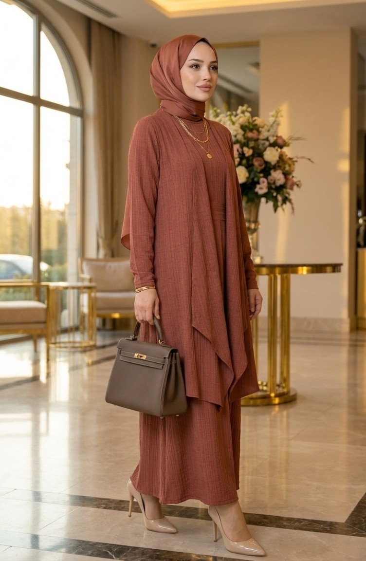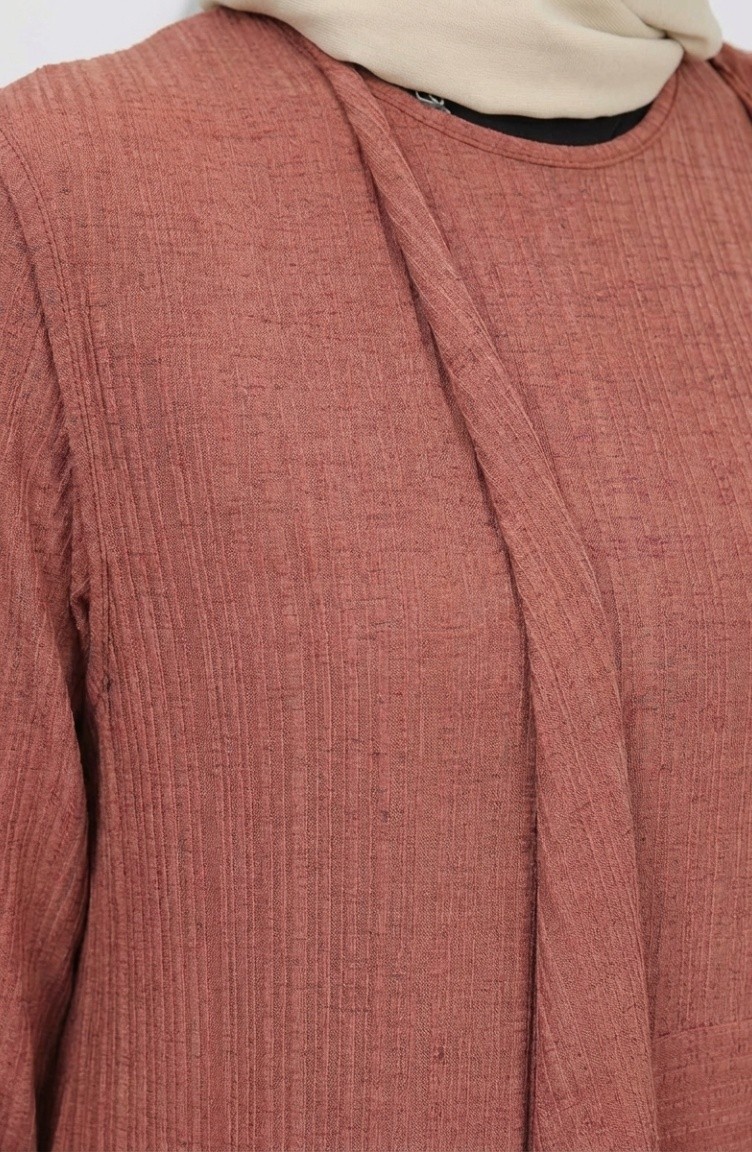 Tobacco color is used. Knitted fabric is used. It has a plain appearance. The Zero collar is preferred for all types of clothing. Suitable for 4 seasons. The size worn by the model, is the one on the image.