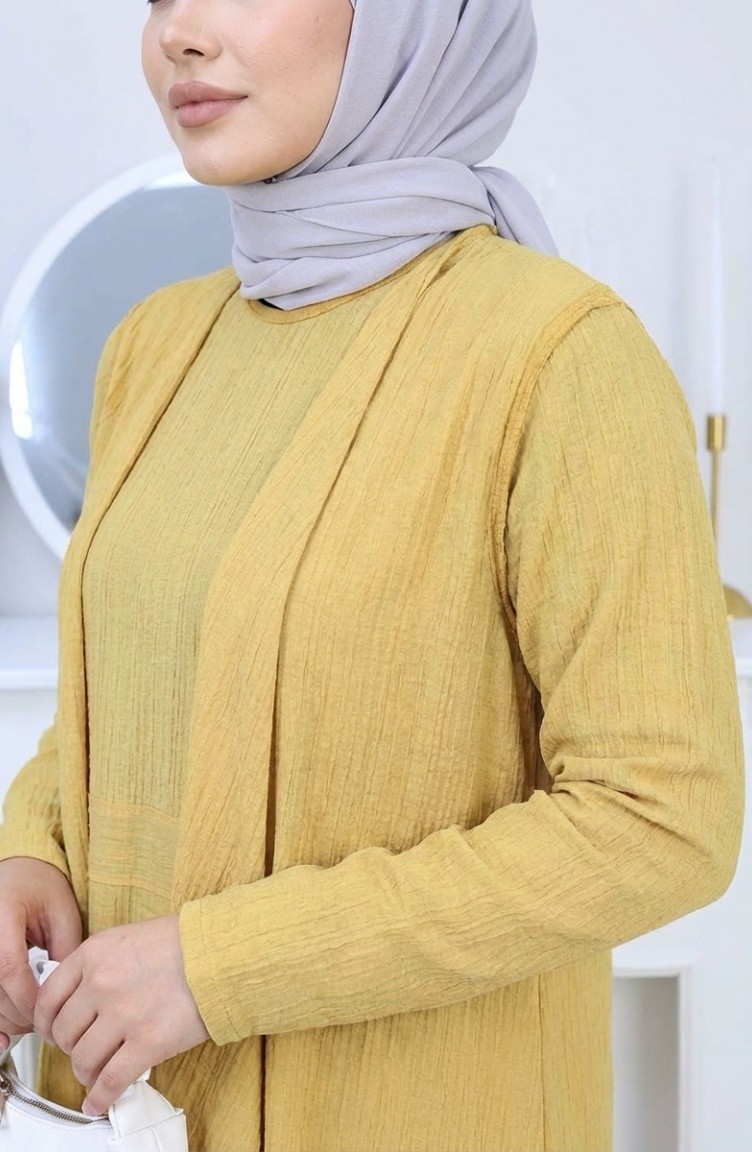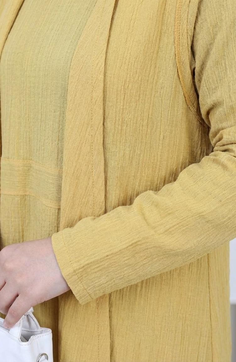 Mustard color is used. Knitted fabric is used. It has a plain appearance. The Zero collar is preferred for all types of clothing. Suitable for 4 seasons. Plus size option available.