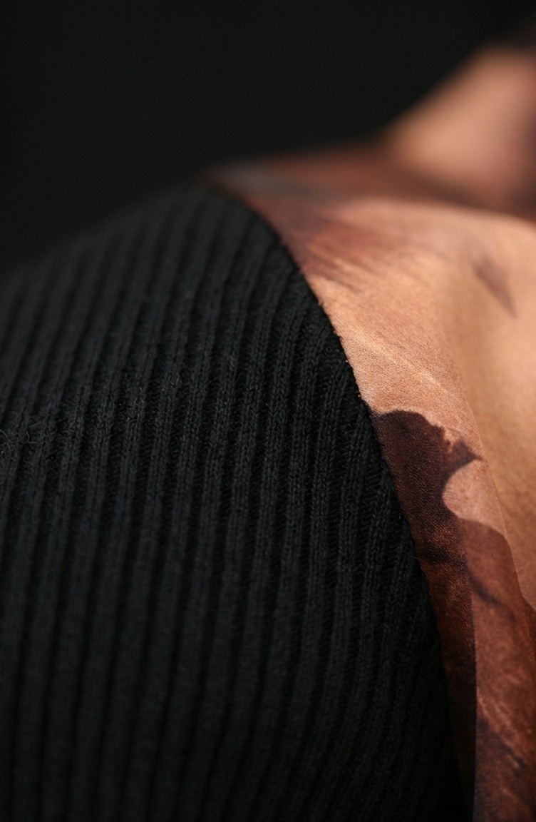 Black color is used. Polyester fabric often prevents wrinkling. Designed with patterned fabric. It's made of elastic sleeves. The Zero collar is preferred for all types of clothing. Suitable for 4 seasons. The size worn by the model, is the one on the image.