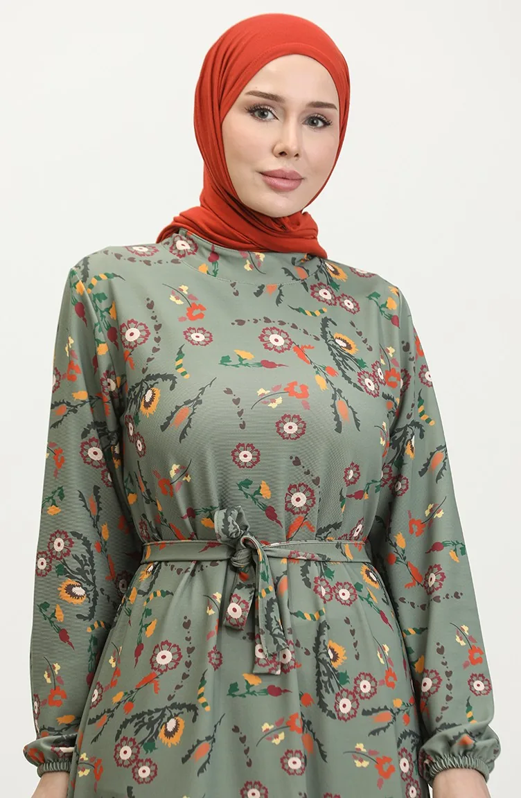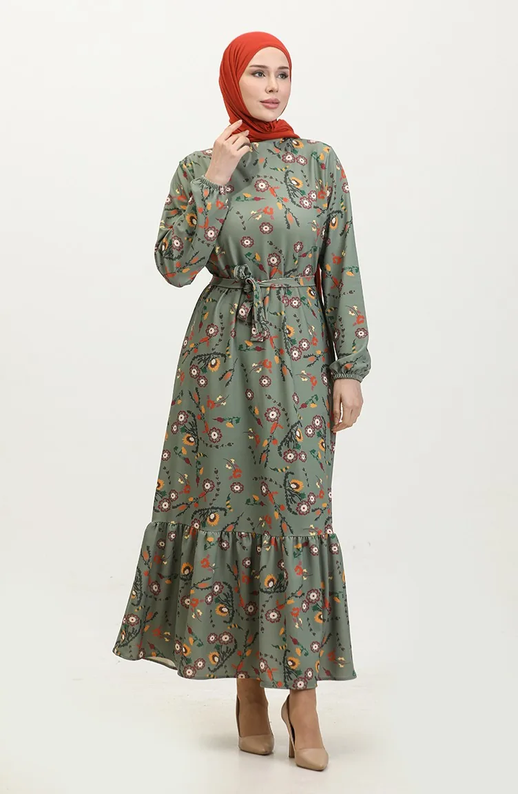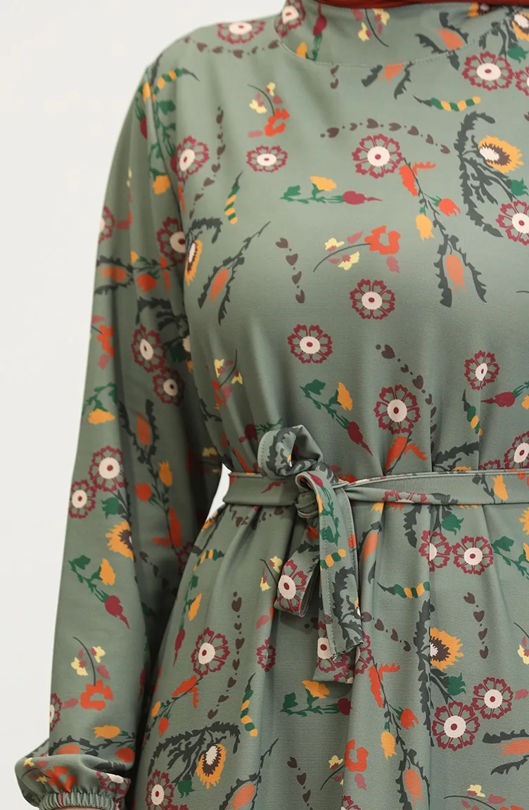 Floral Patterned Belted Dress 0365-02 Khaki 0365-02