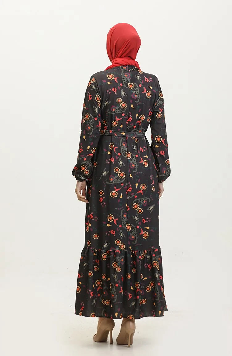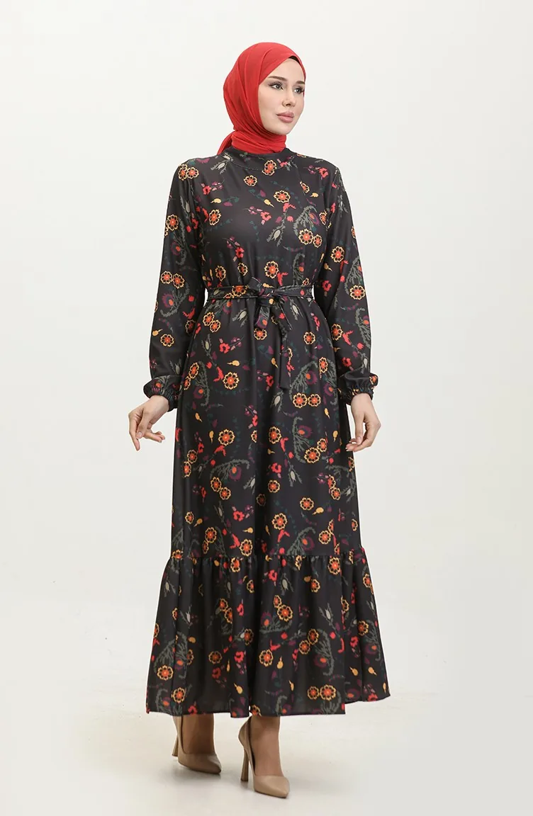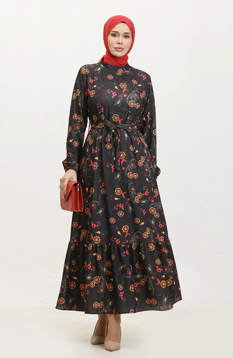 Floral Patterned Belted Dress 0365-03 Black 0365-03