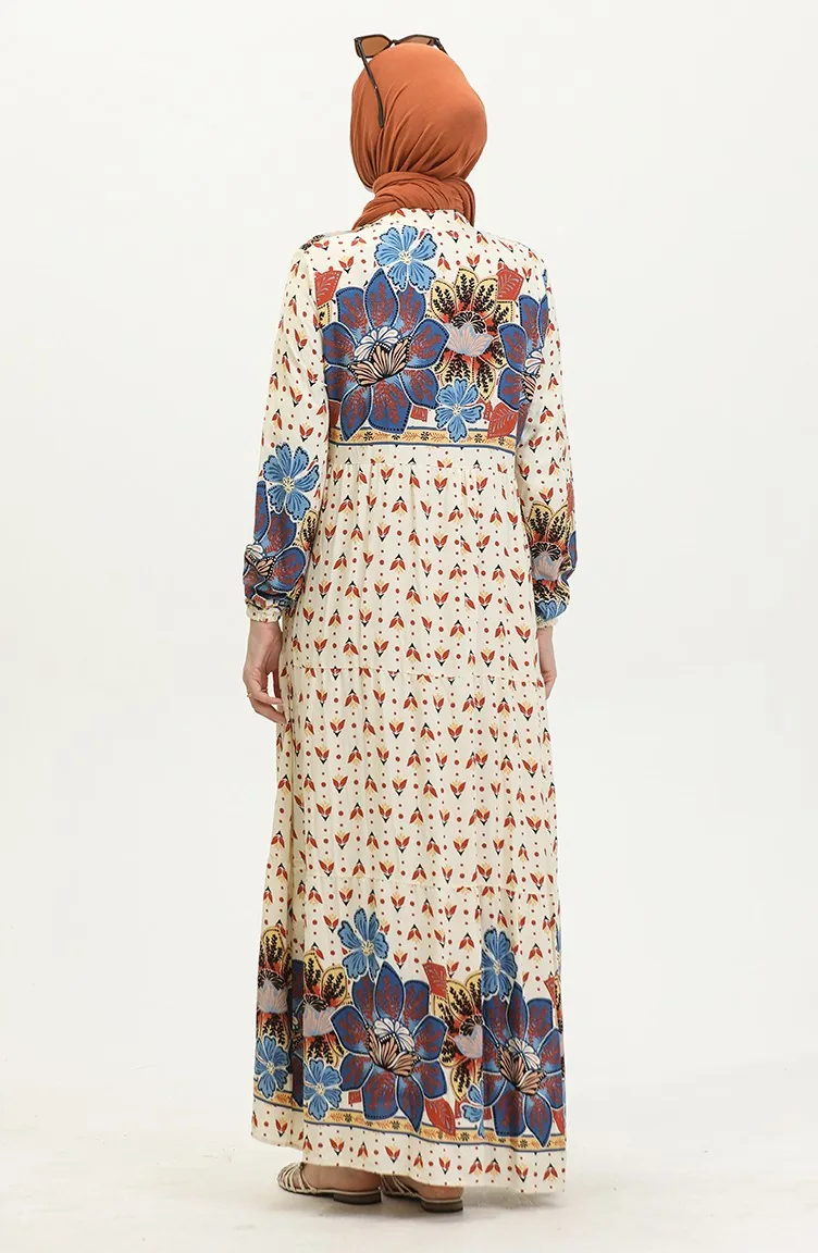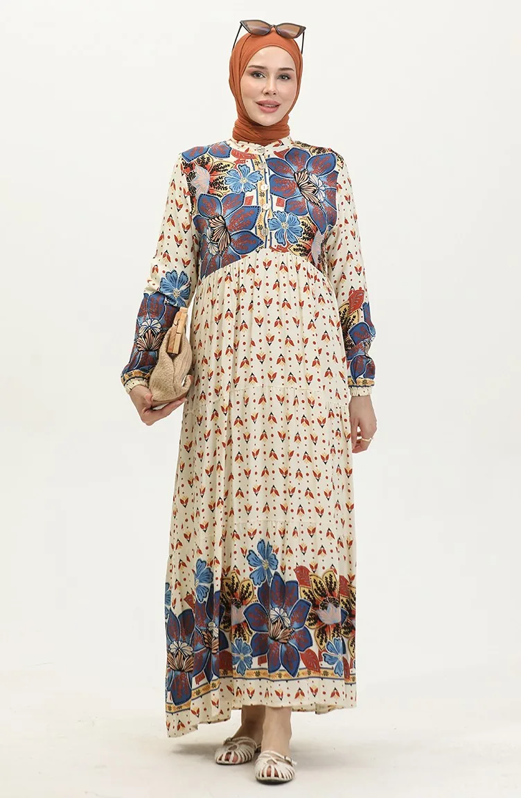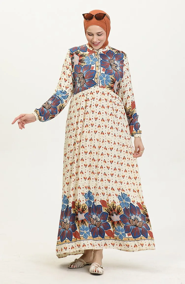 Flower Patterned Dress 4093-03 Navy Blue 4093-03