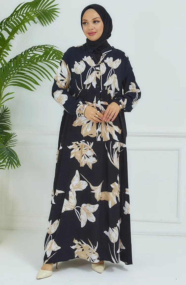 Black color is used. Viscose is a type of synthetic fabric and is convenient to use. Designed with patterned fabric. The product is used unlined. Tippet collar is prefered. Suitable for 4 seasons. Plus size option available.