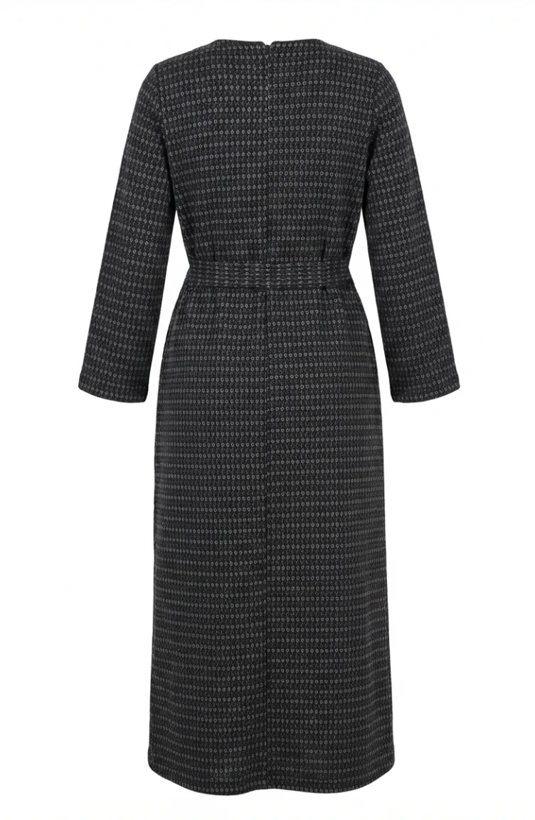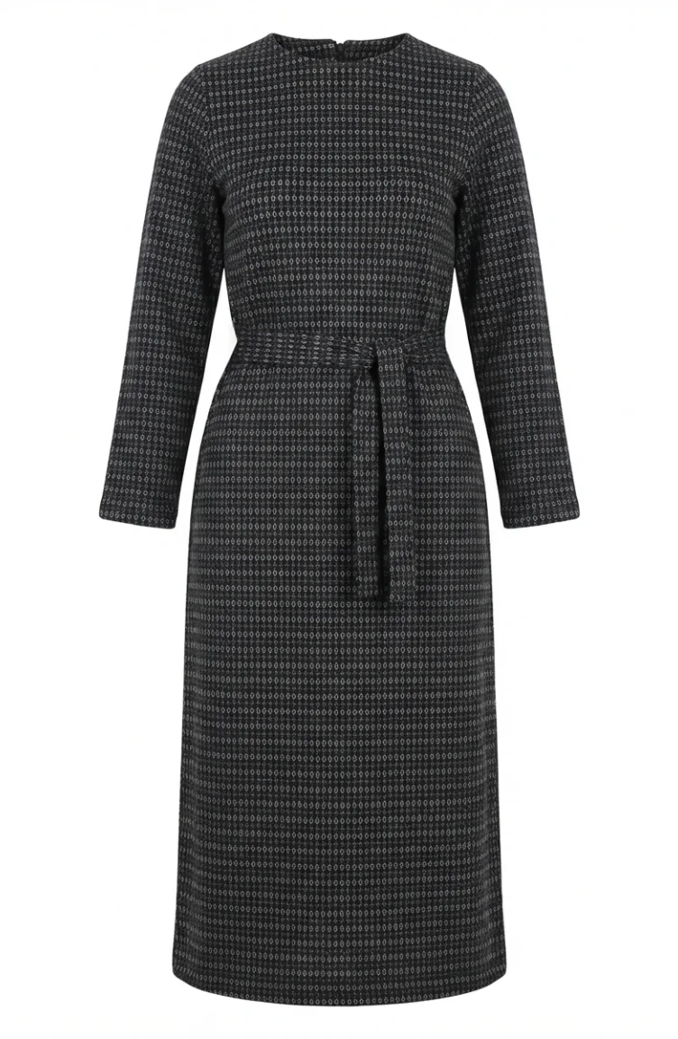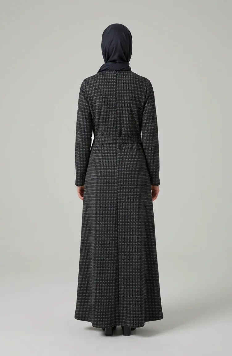 Geometric Patterned Belted Hijab Dress 2222-03 Dark Gray 2222-03