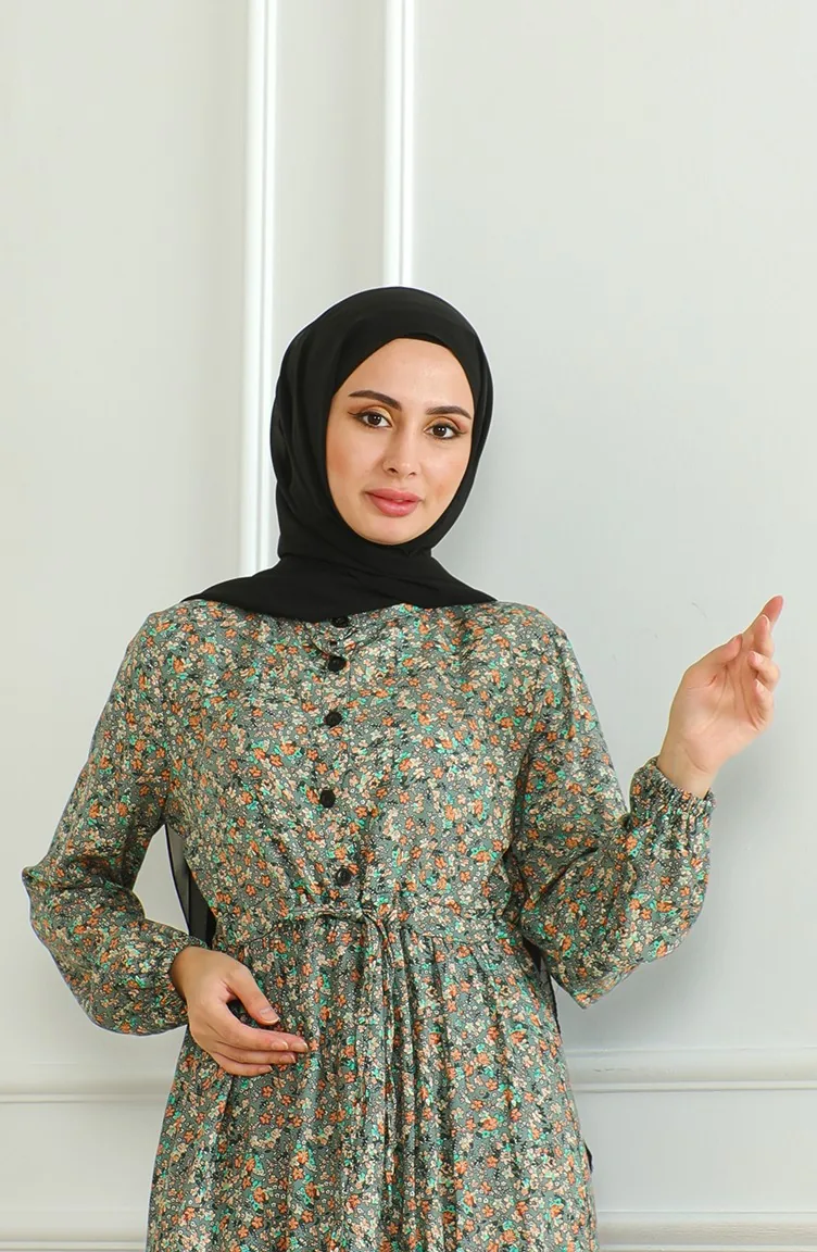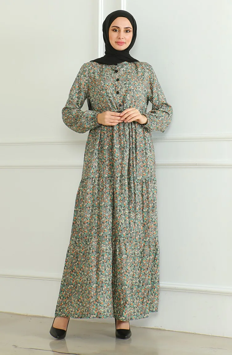 Half Button Patterned Viscose Dress 0500-06 Gray Green 0500-06