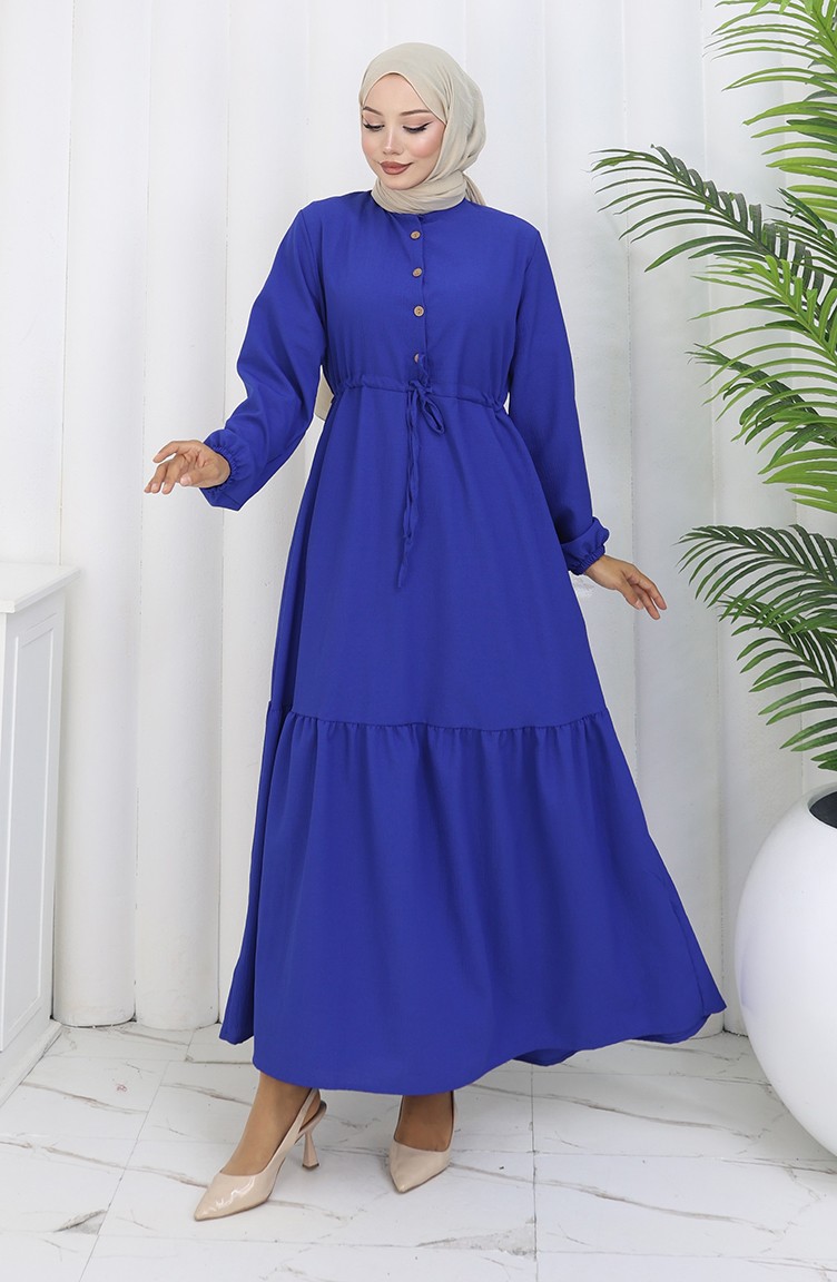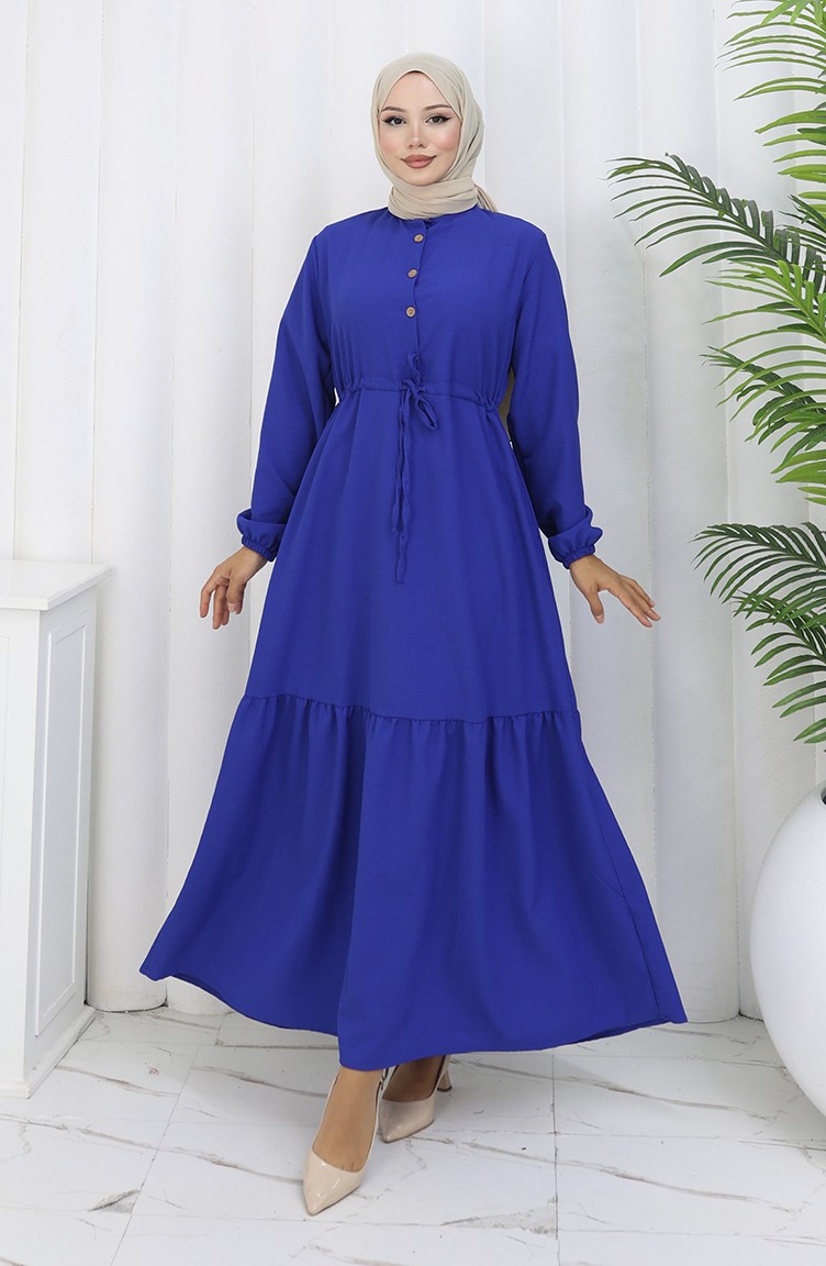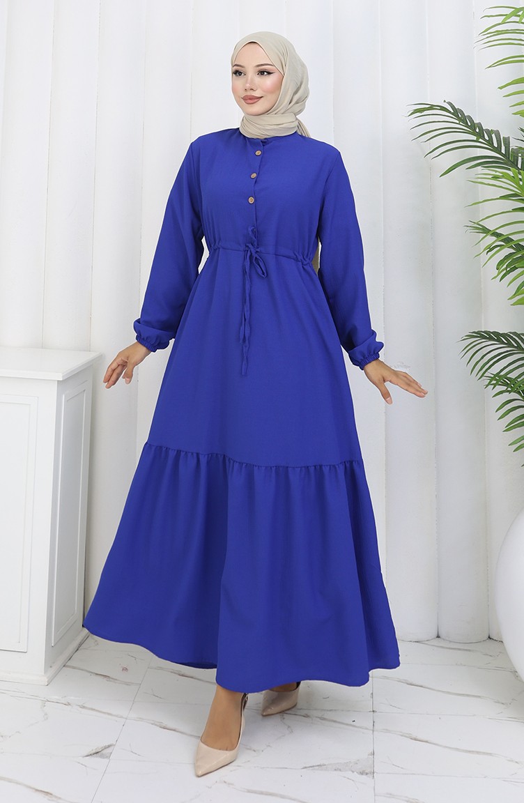 Saxon blue color is used. The cotton fabric has an absorbent texture. It has a plain appearance. Buttons have been used to make it easy to use. It's made of elastic sleeves. Tippet collar is prefered. Suitable for 4 seasons. Length is adjusted according to standard size measurements.