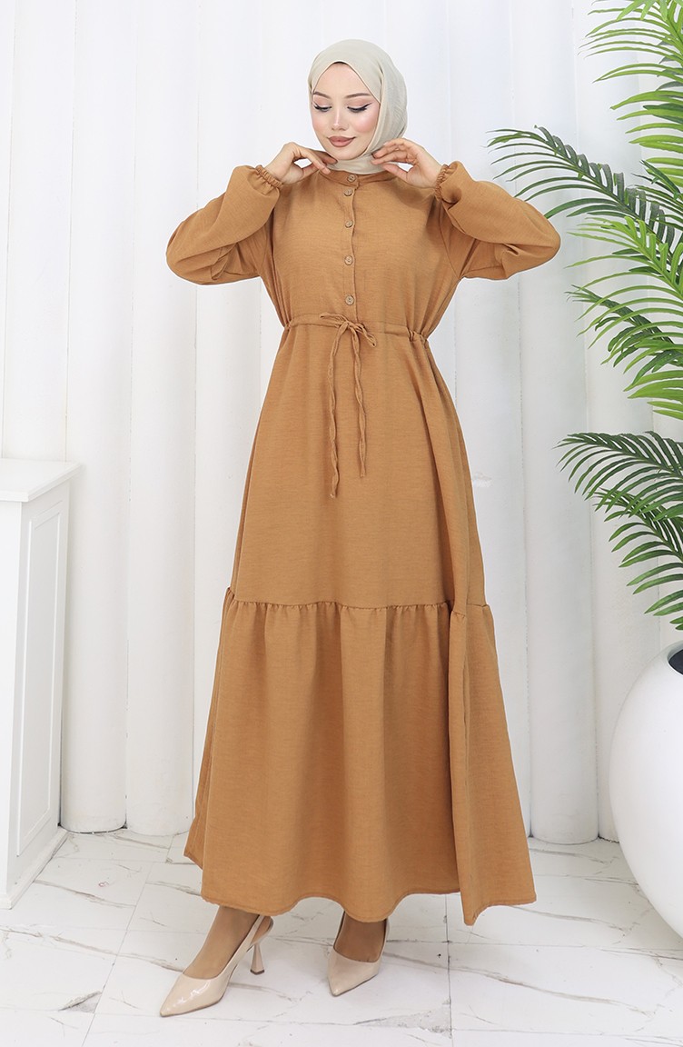 Half Buttoned Dress With Tie At Waist 0182-04 Tan 0182-04