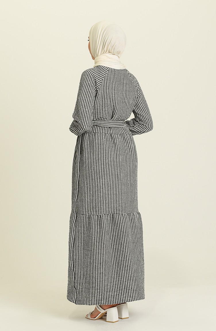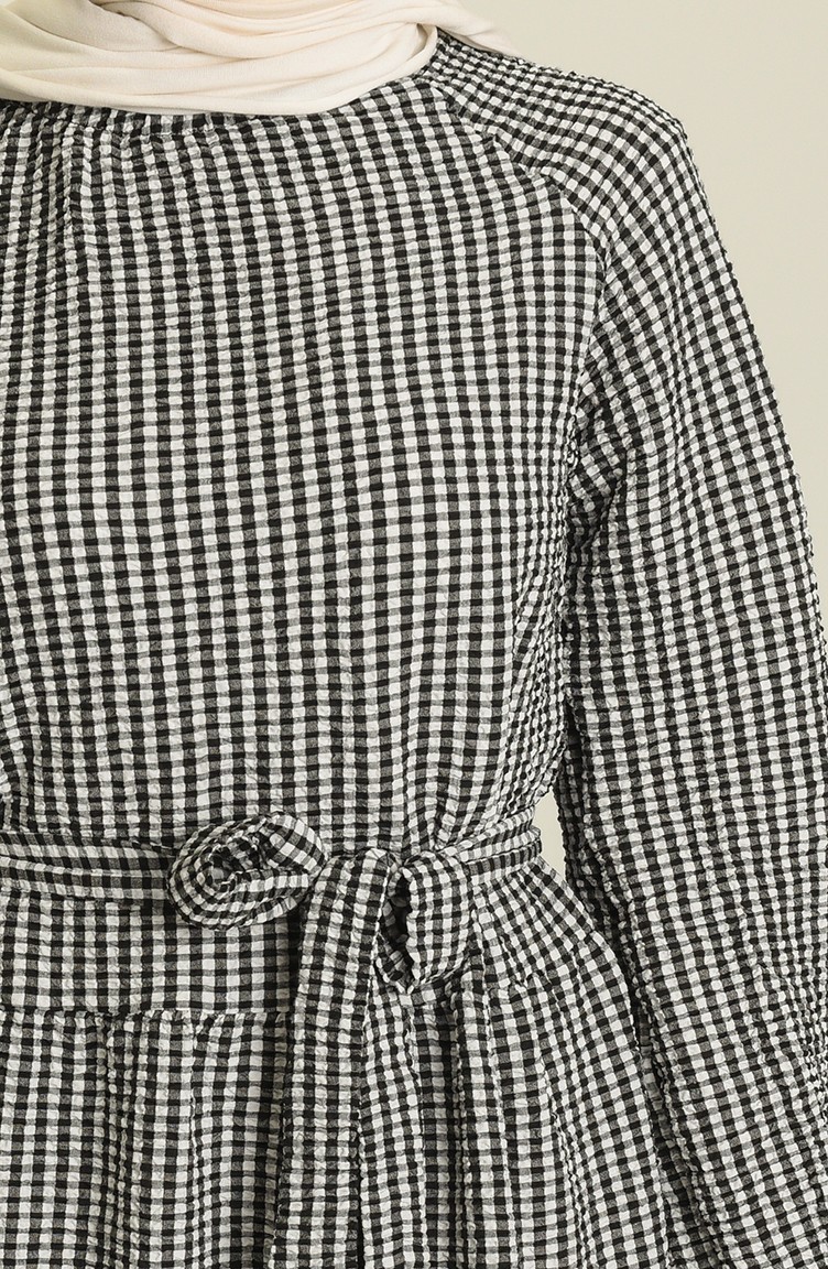 Black color is used. The cotton fabric has an absorbent texture. Designed with patterned fabric. The product is used unlined. It's made of elastic sleeves. The Zero collar is preferred for all types of clothing. Designed for summer use. The size worn by the model, is the one on the image.