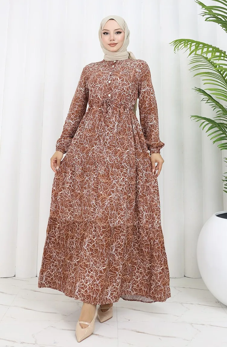 Tobacco color is used. The cotton fabric has an absorbent texture. Designed with patterned fabric. The product is used unlined. Long sleeve product. Tippet collar is prefered. Plus size option available.