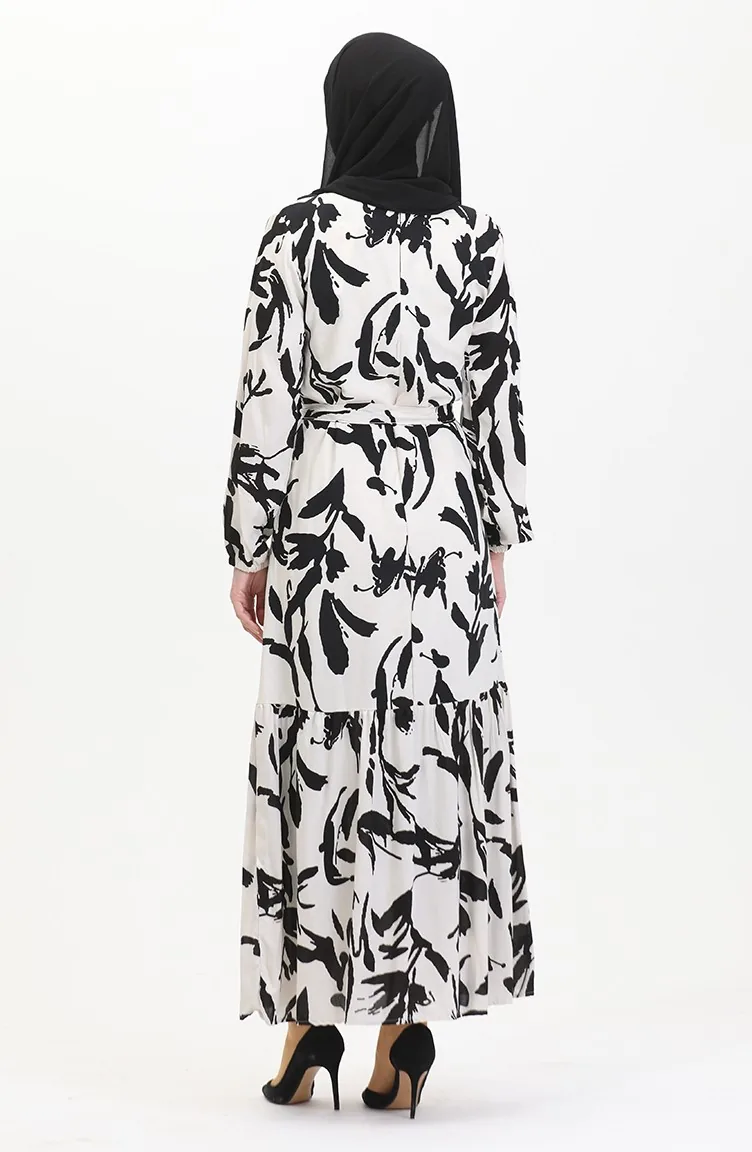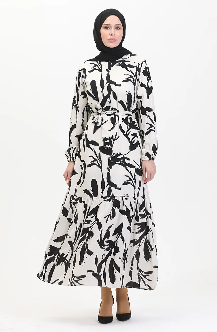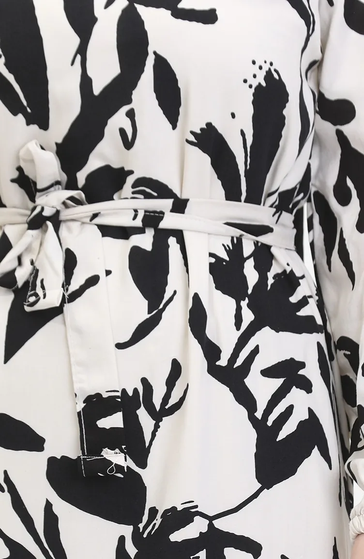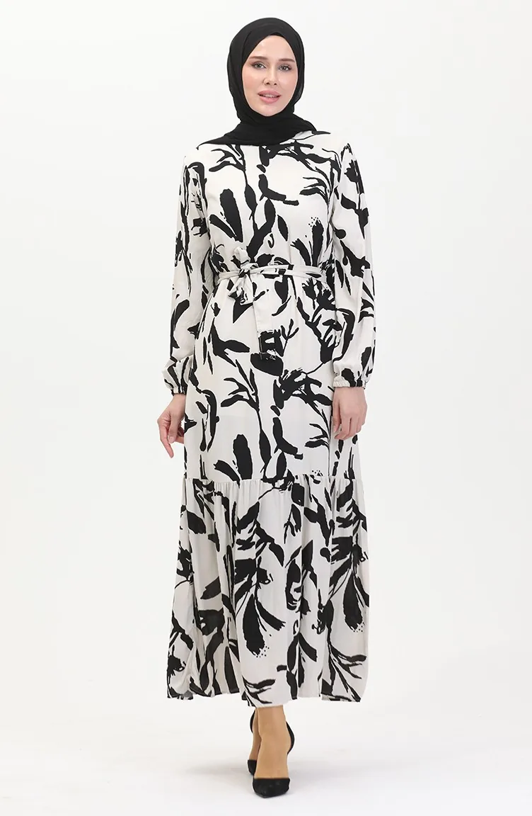 Patterned Belted Dress 0444-05 Ecru Black 0444-05