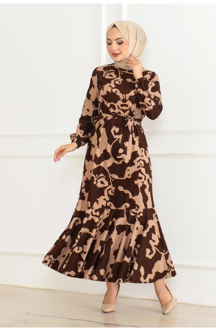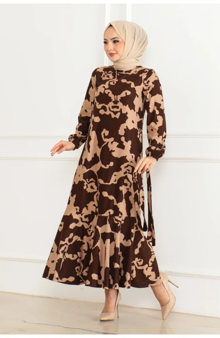 Patterned Dress With Flounce Skirt 3151-02 Brown 3151-02