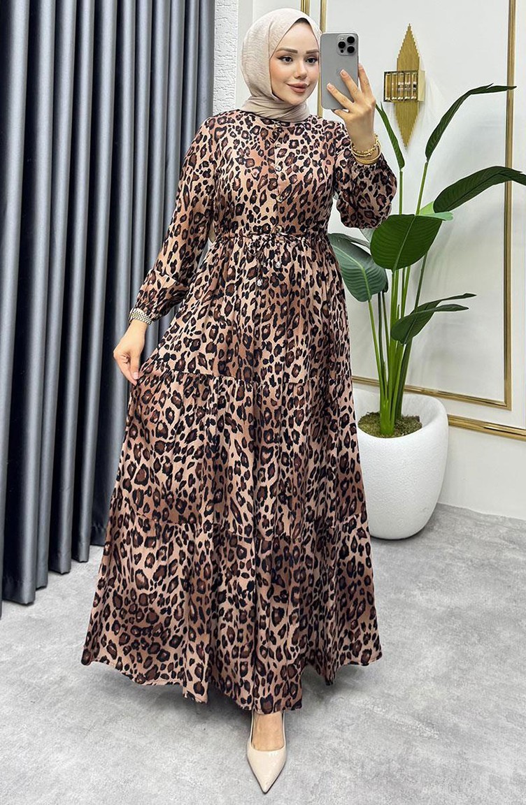 Tunneled Waist Leopard Dress 7130-02 Brown 7130-02