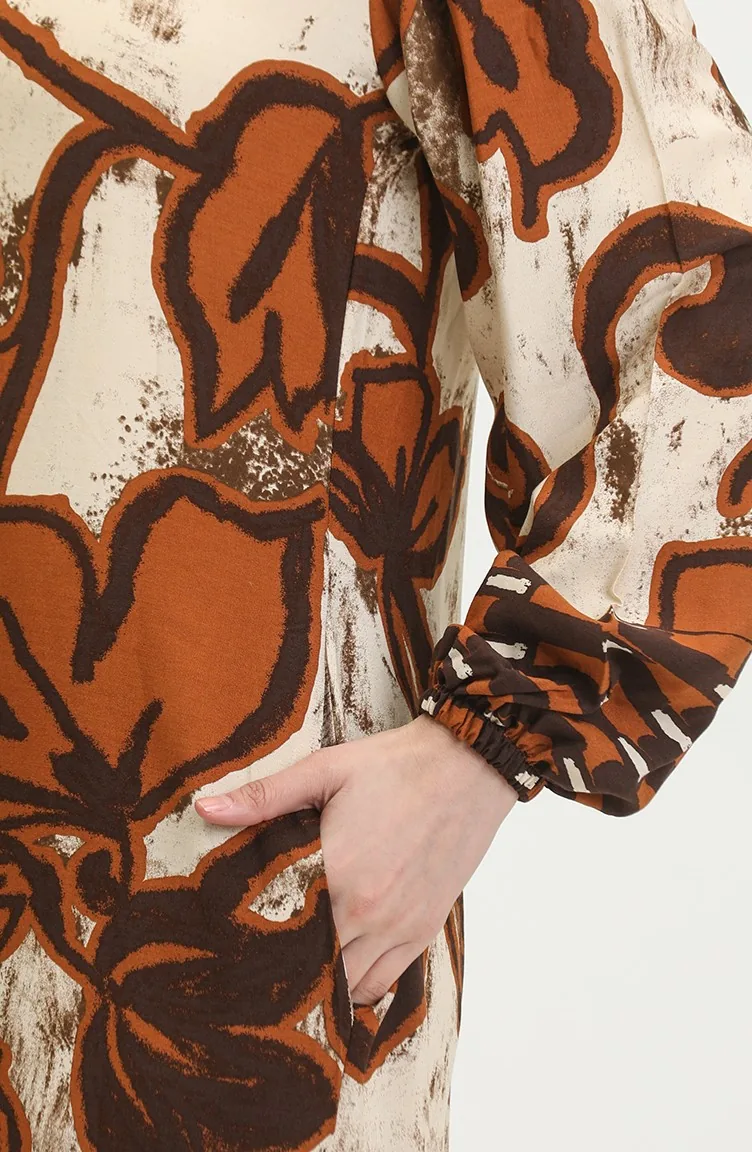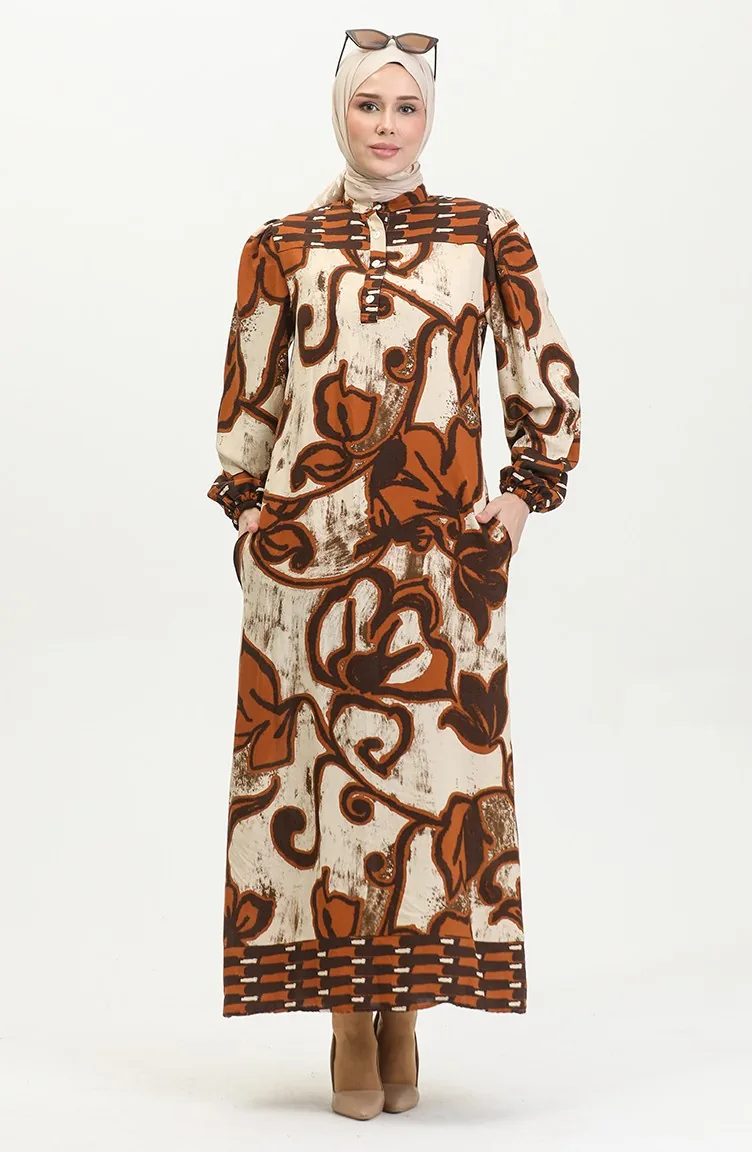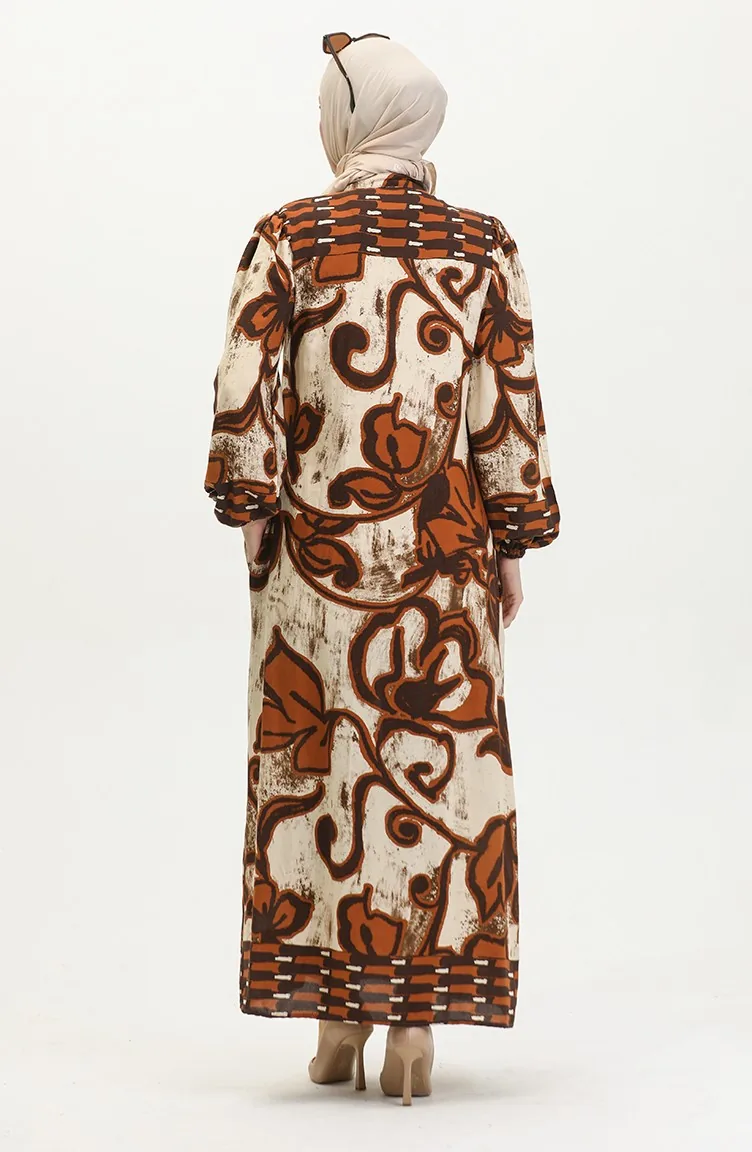Tobacco color is used. The cotton fabric has an absorbent texture. Designed with patterned fabric. The product is used unlined. It's made of elastic sleeves. Tippet collar is prefered. Rahat. Plus size option available.