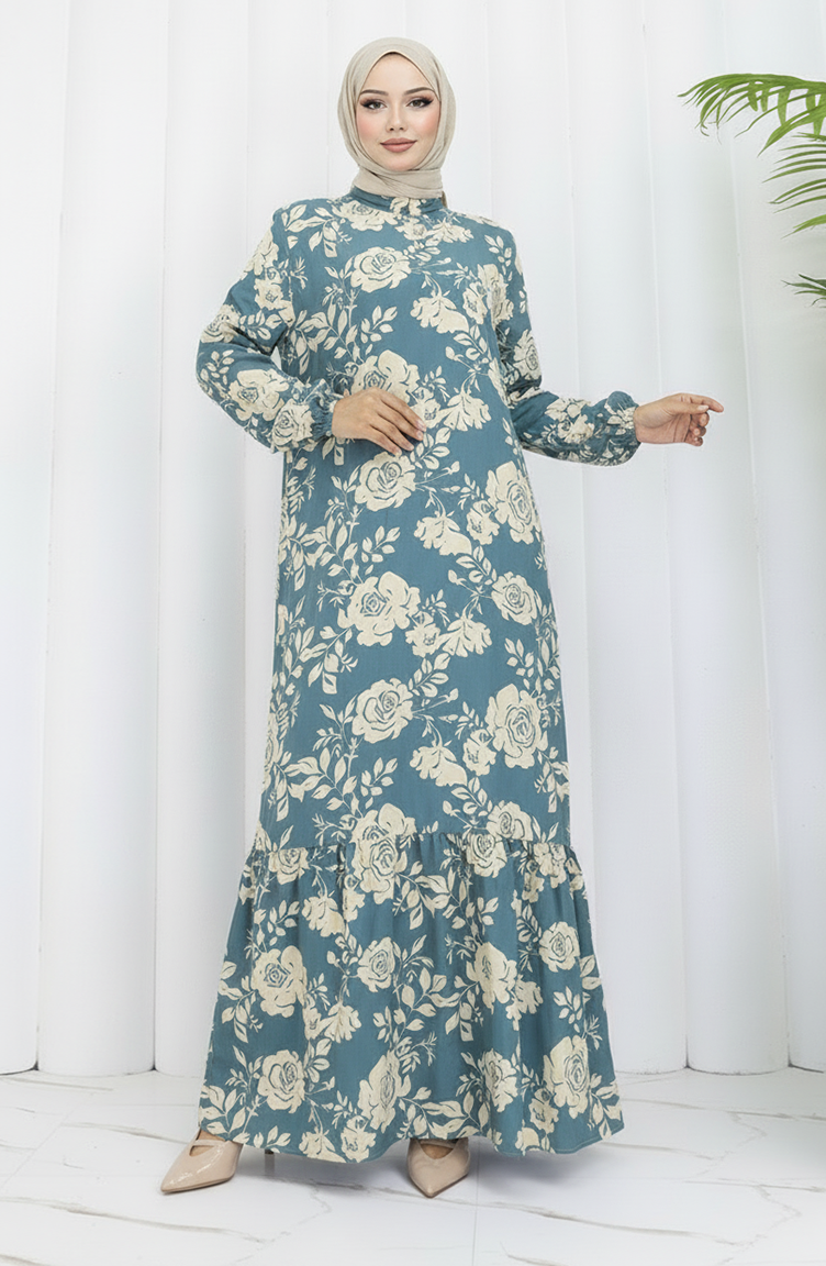 Viscose Fabric Elastic Sleeve Patterned Dress 2037-04 Almond Green 2037-04