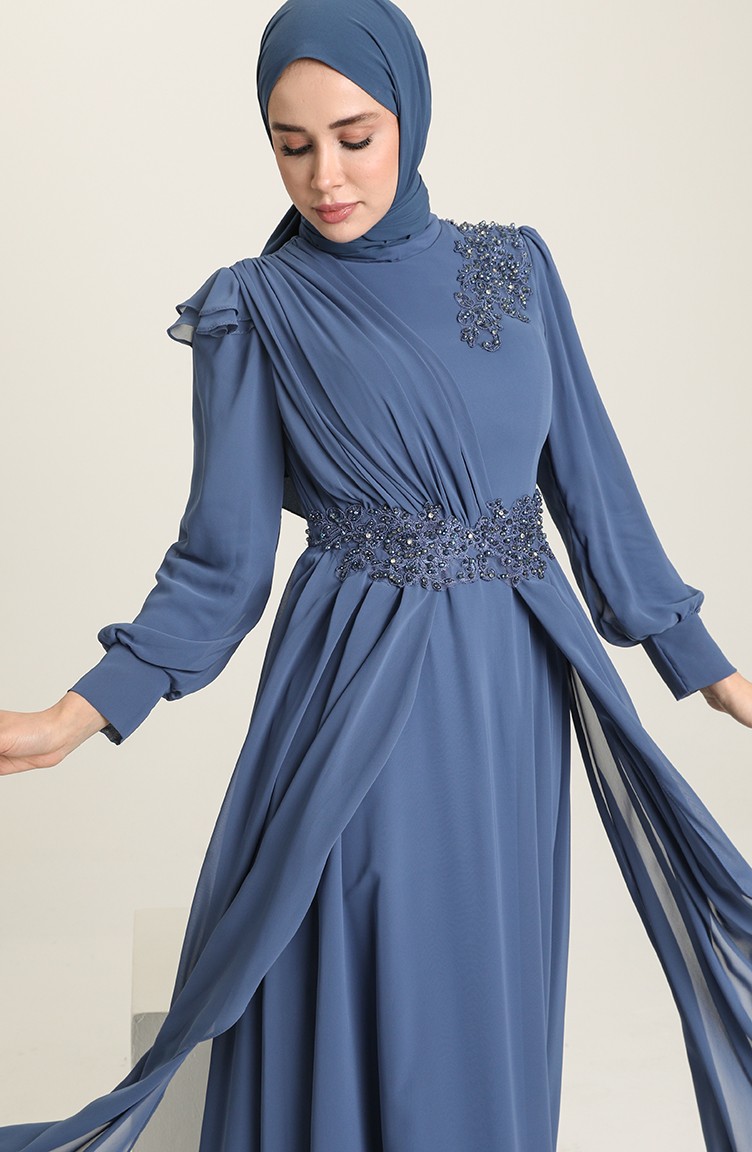Boncuk İşlemeli Abiye Elbise 4932-02 İndigo 4932-02