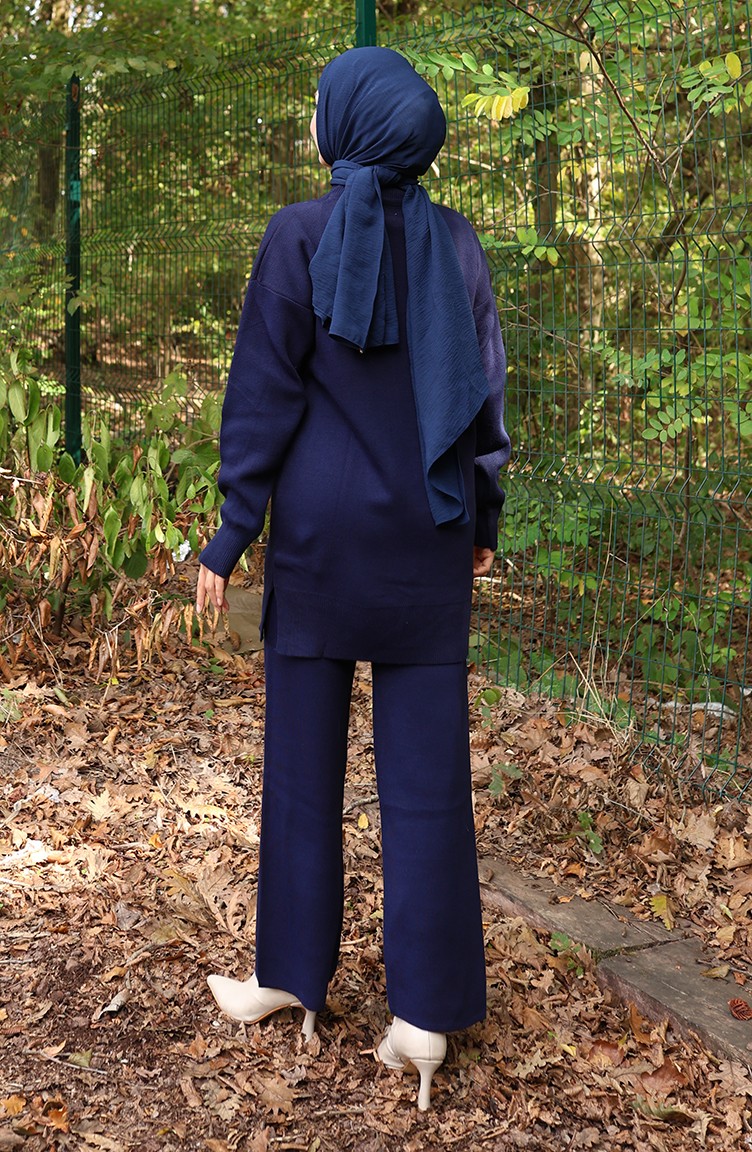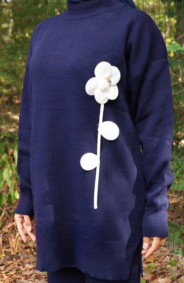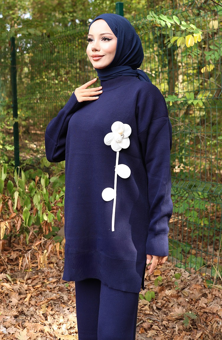 Knitwear Floral Figured Tunic Trousers Two Piece Suit 1017-01 Navy Blue 1017-01