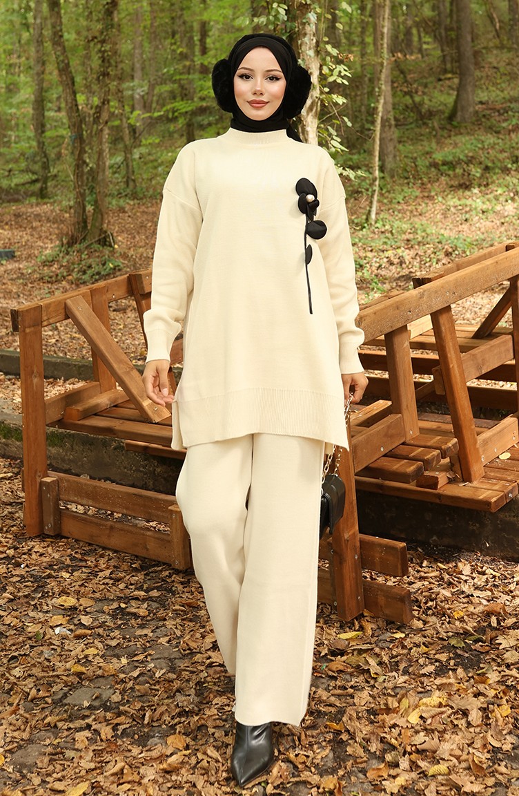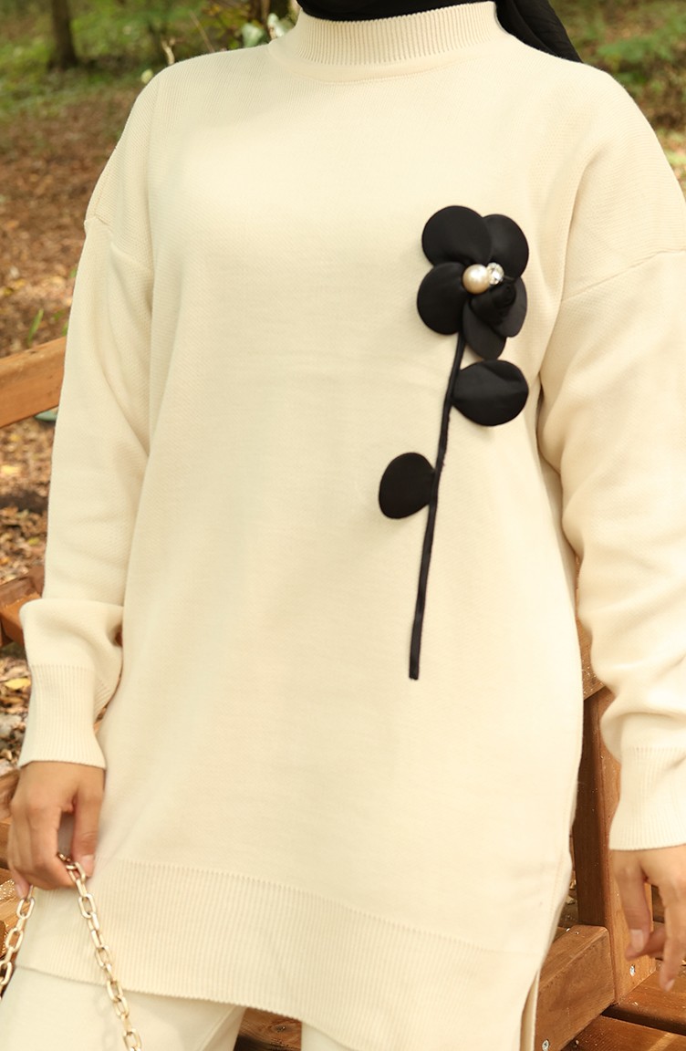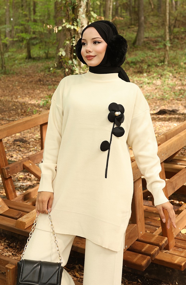 Knitwear Floral Figured Tunic Trousers Two Piece Suit 1017-07 Beige 1017-07