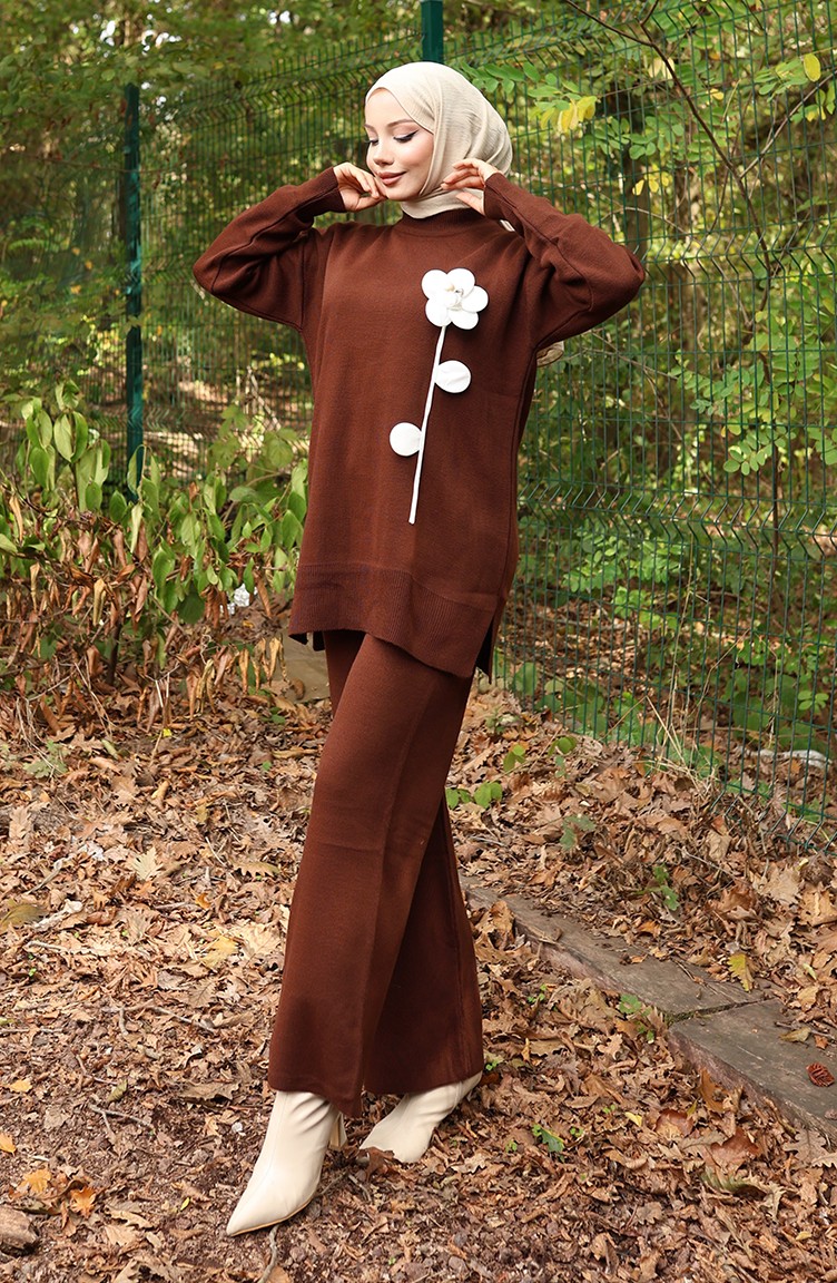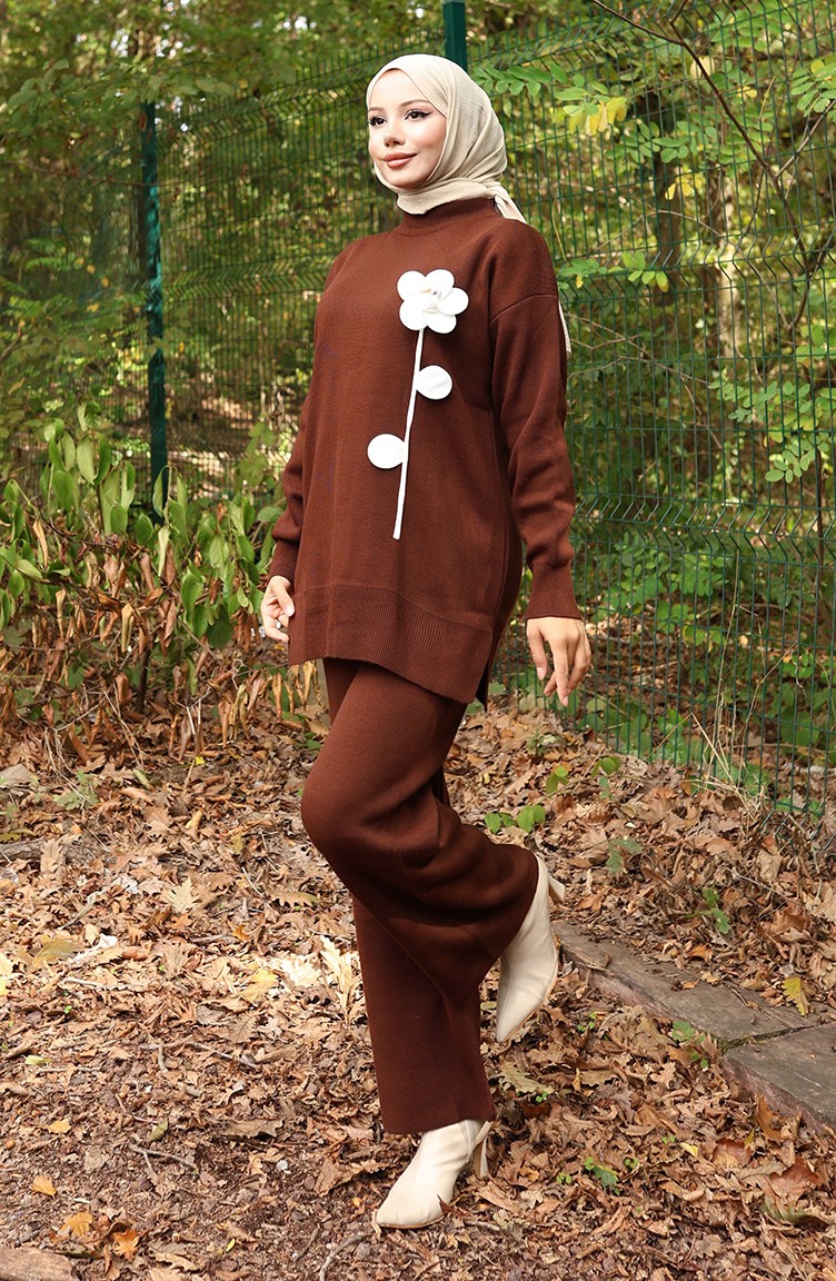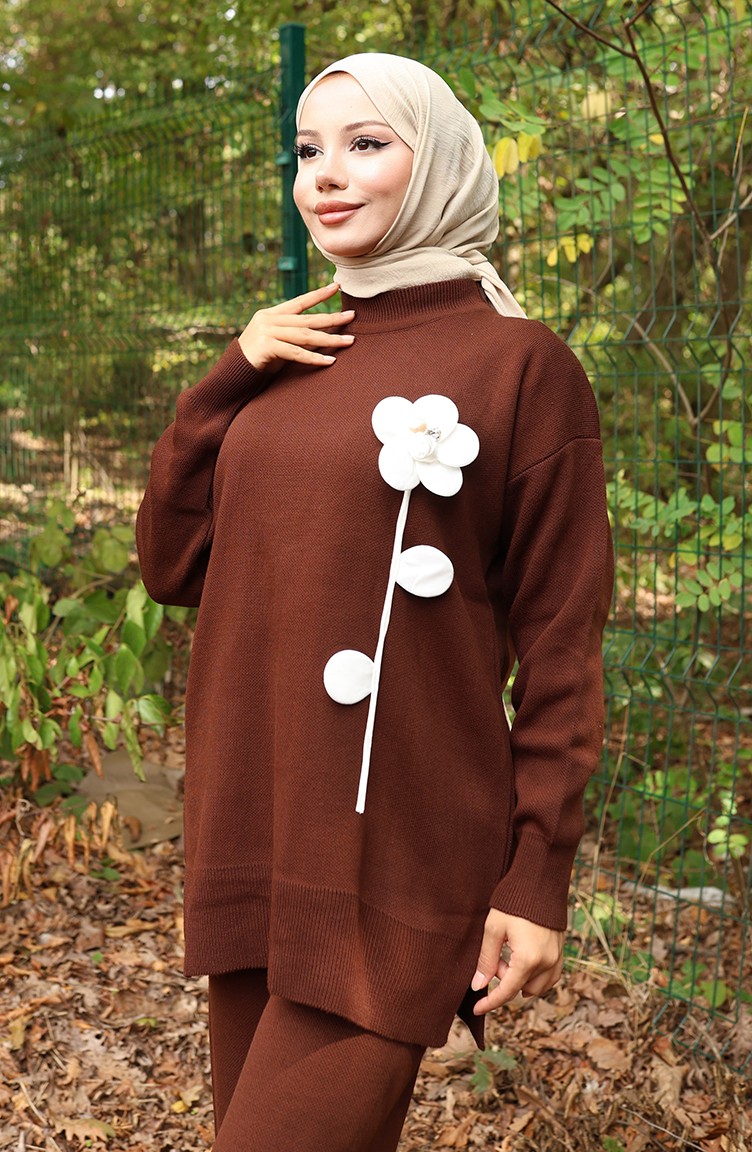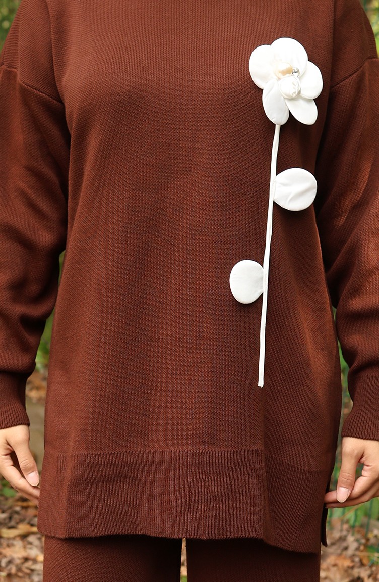 Knitwear Floral Figured Tunic Trousers Two Piece Suit 1017-08 Brown 1017-08